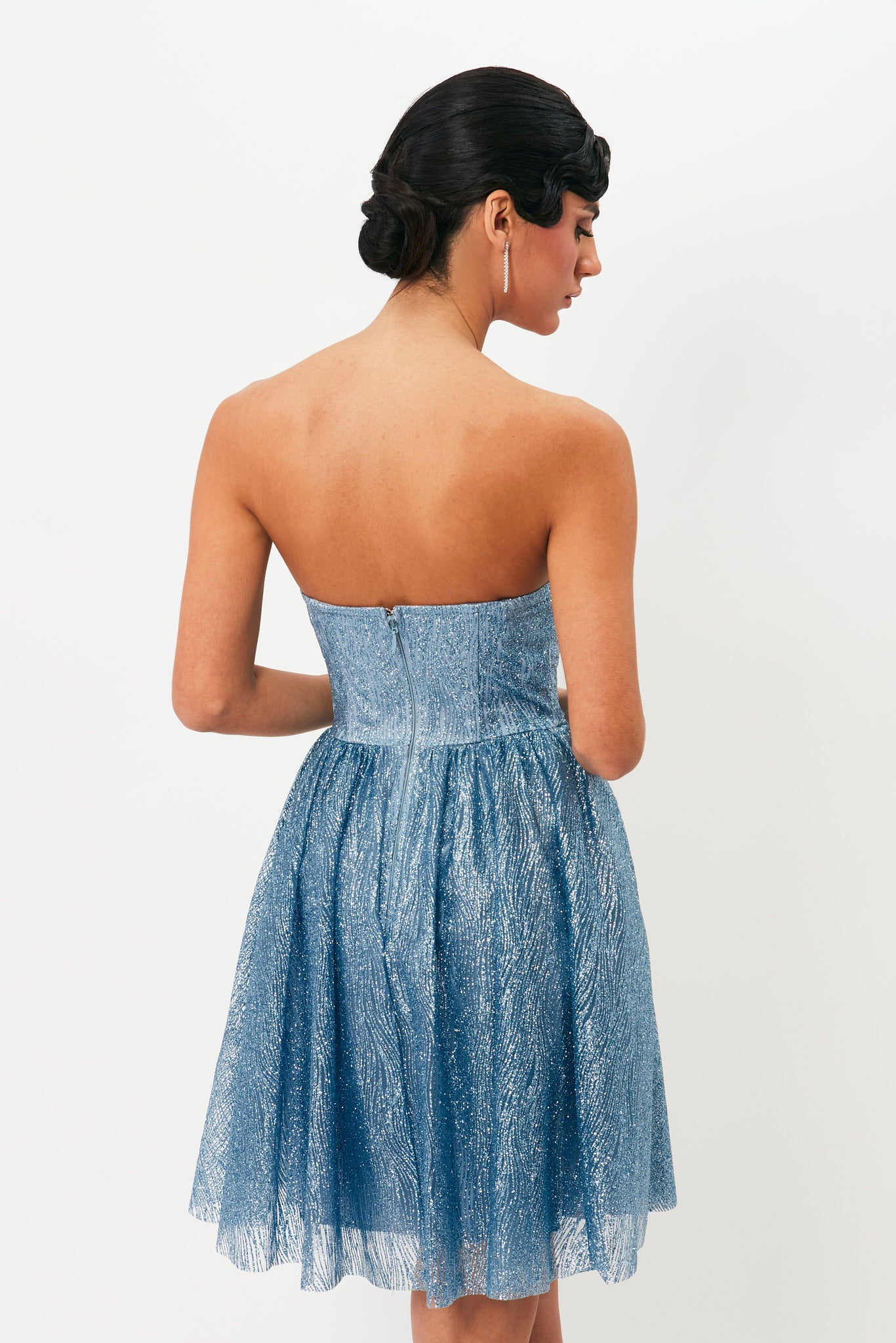 L'intero vestito è completamente ricoperto di brillantini, creando un effetto luminoso e spettacolare ad ogni movimento. La gonna lunga e fluida, impreziosita da riflessi scintillanti, dona un’aura da vera diva, perfetta per serate di gala, eventi esclusivi e occasioni eleganti.