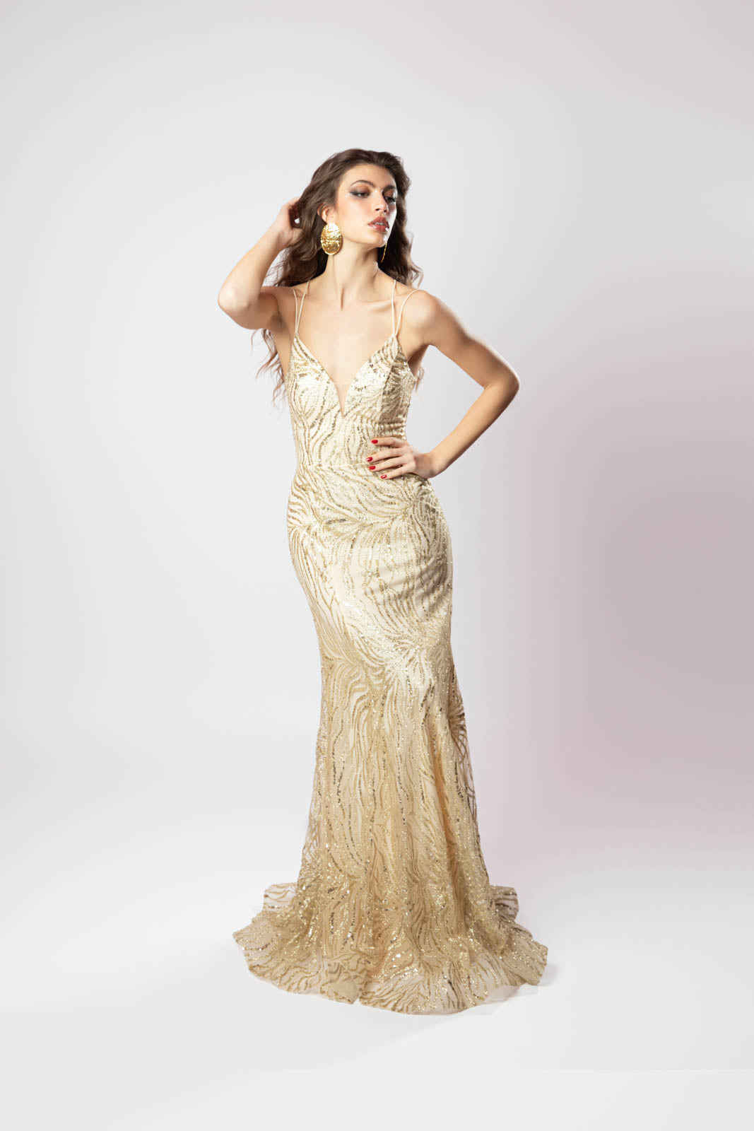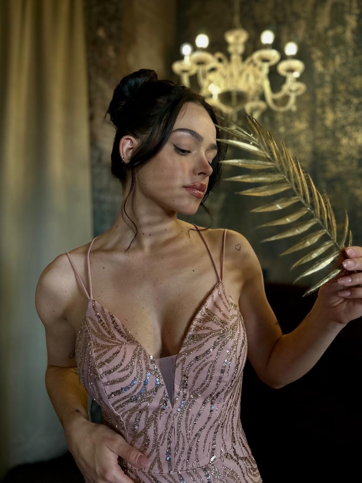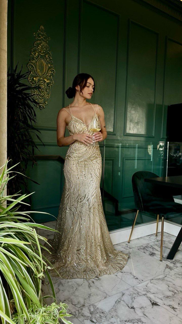 Un capo raffinato e scintillante, perfetto per le occasioni più speciali. Questo abito lungo a sirena esalta la silhouette con una vestibilità aderente che si apre elegantemente sul fondo, creando un effetto slanciato e sofisticato. La scollatura a V con spalline sottili aggiunge un tocco di sensualità ed eleganza, valorizzando il décolleté con grazia.