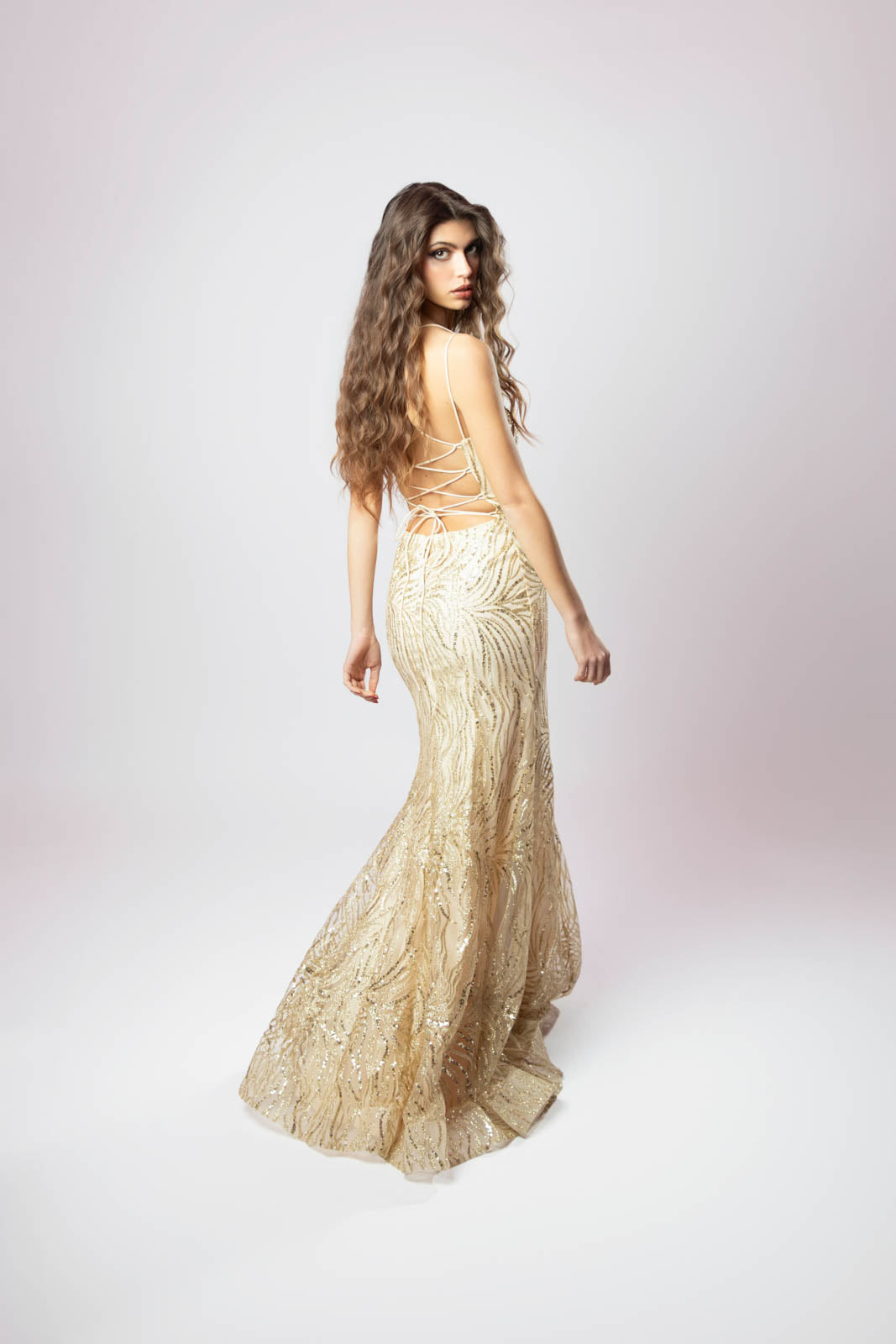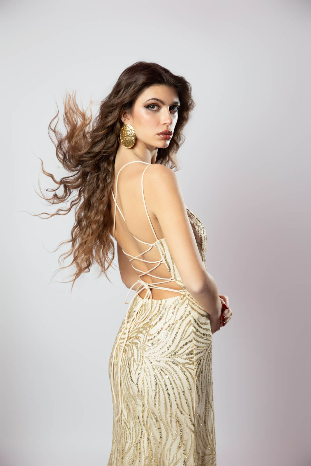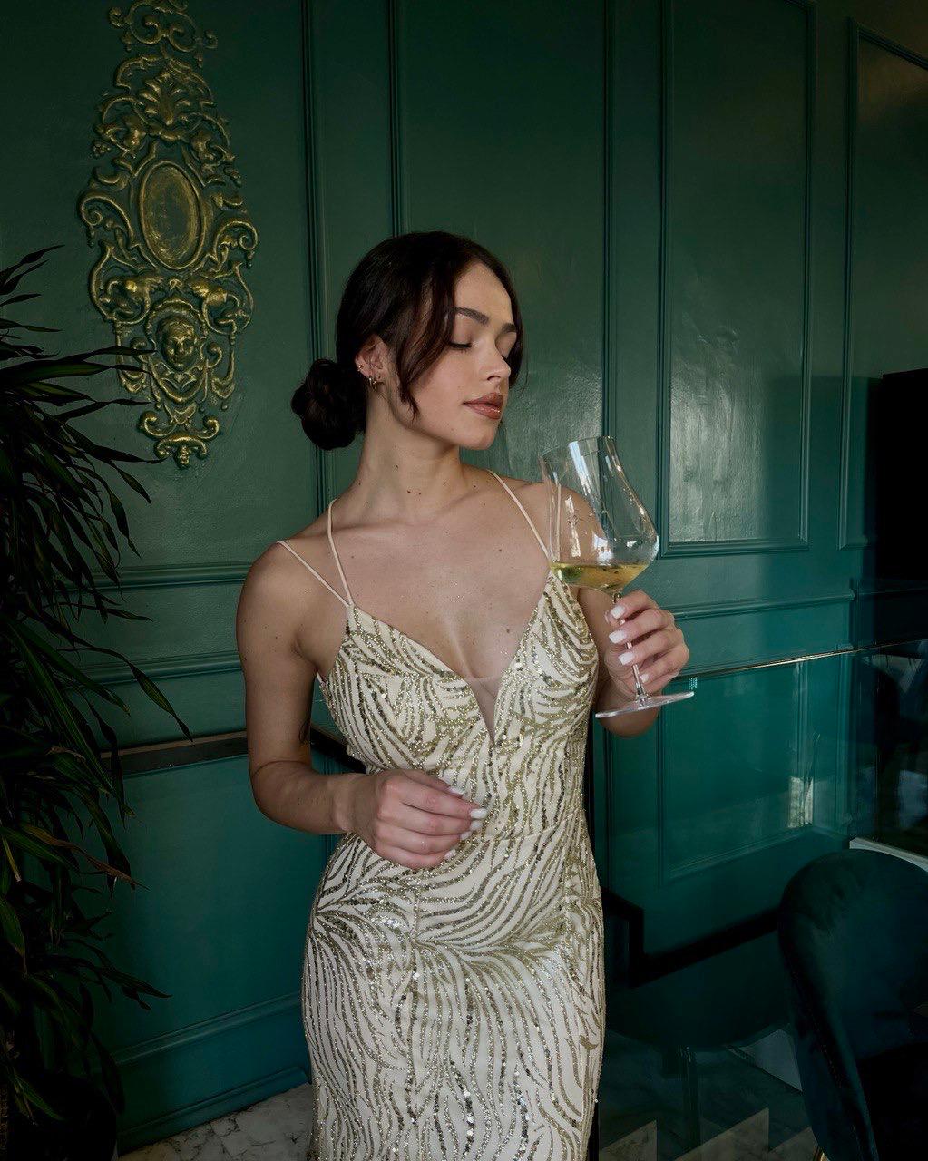 Un capo raffinato e scintillante, perfetto per le occasioni più speciali. Questo abito lungo a sirena esalta la silhouette con una vestibilità aderente che si apre elegantemente sul fondo, creando un effetto slanciato e sofisticato. La scollatura a V con spalline sottili aggiunge un tocco di sensualità ed eleganza, valorizzando il décolleté con grazia.