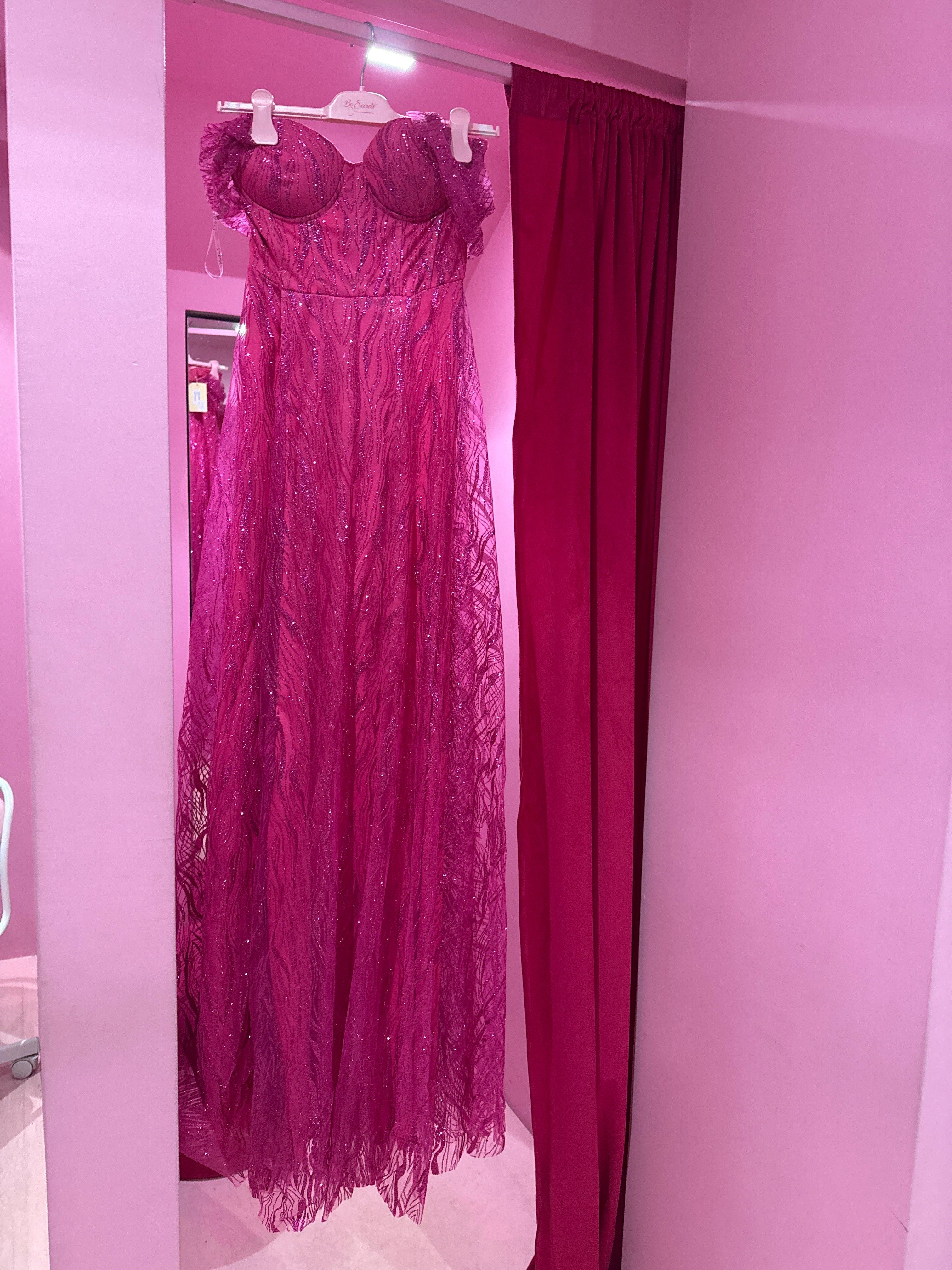 L'intero vestito è completamente ricoperto di brillantini, creando un effetto luminoso e spettacolare ad ogni movimento. La gonna lunga e fluida, impreziosita da riflessi scintillanti, dona un’aura da vera diva, perfetta per serate di gala, eventi esclusivi e occasioni eleganti.