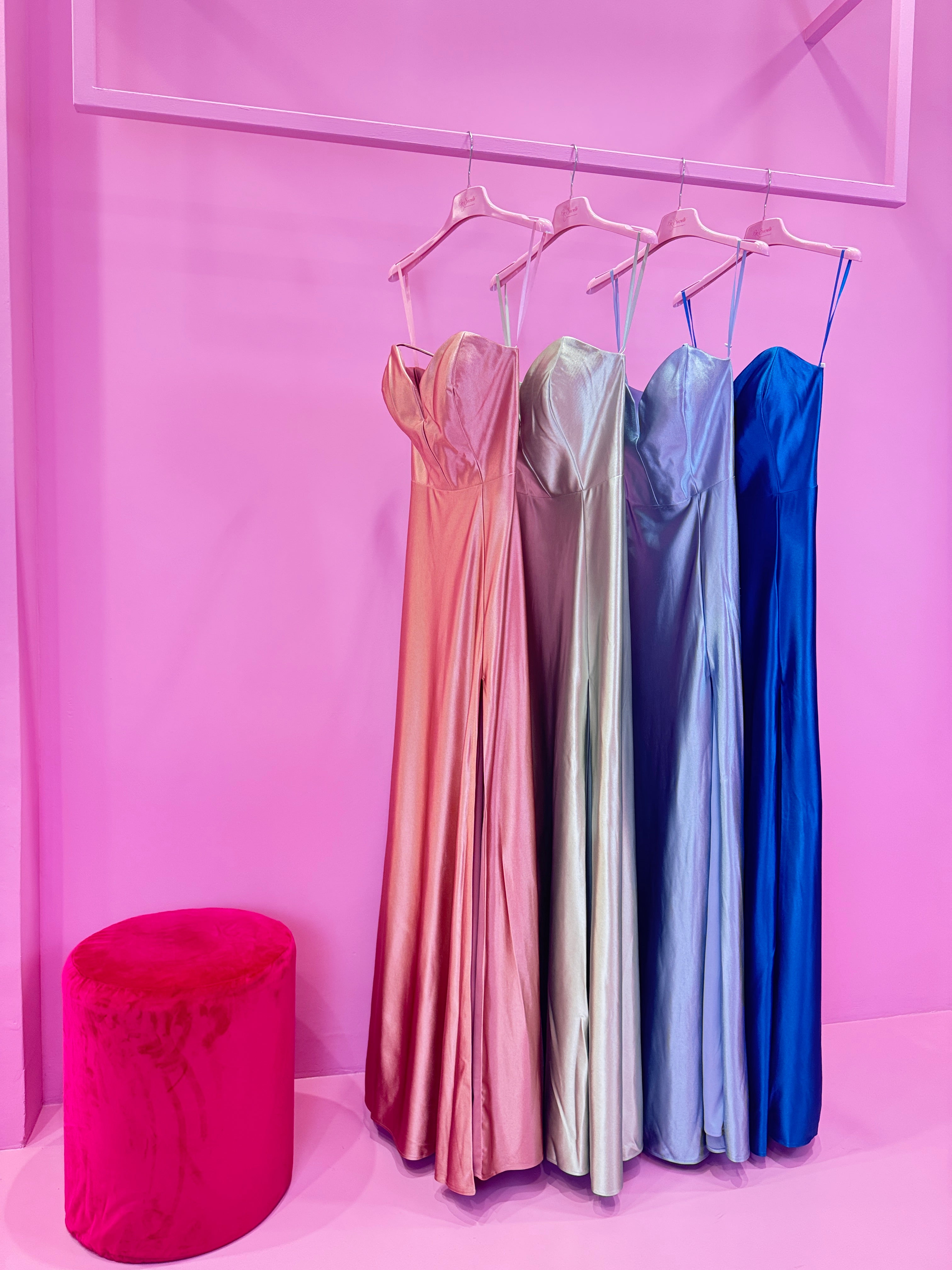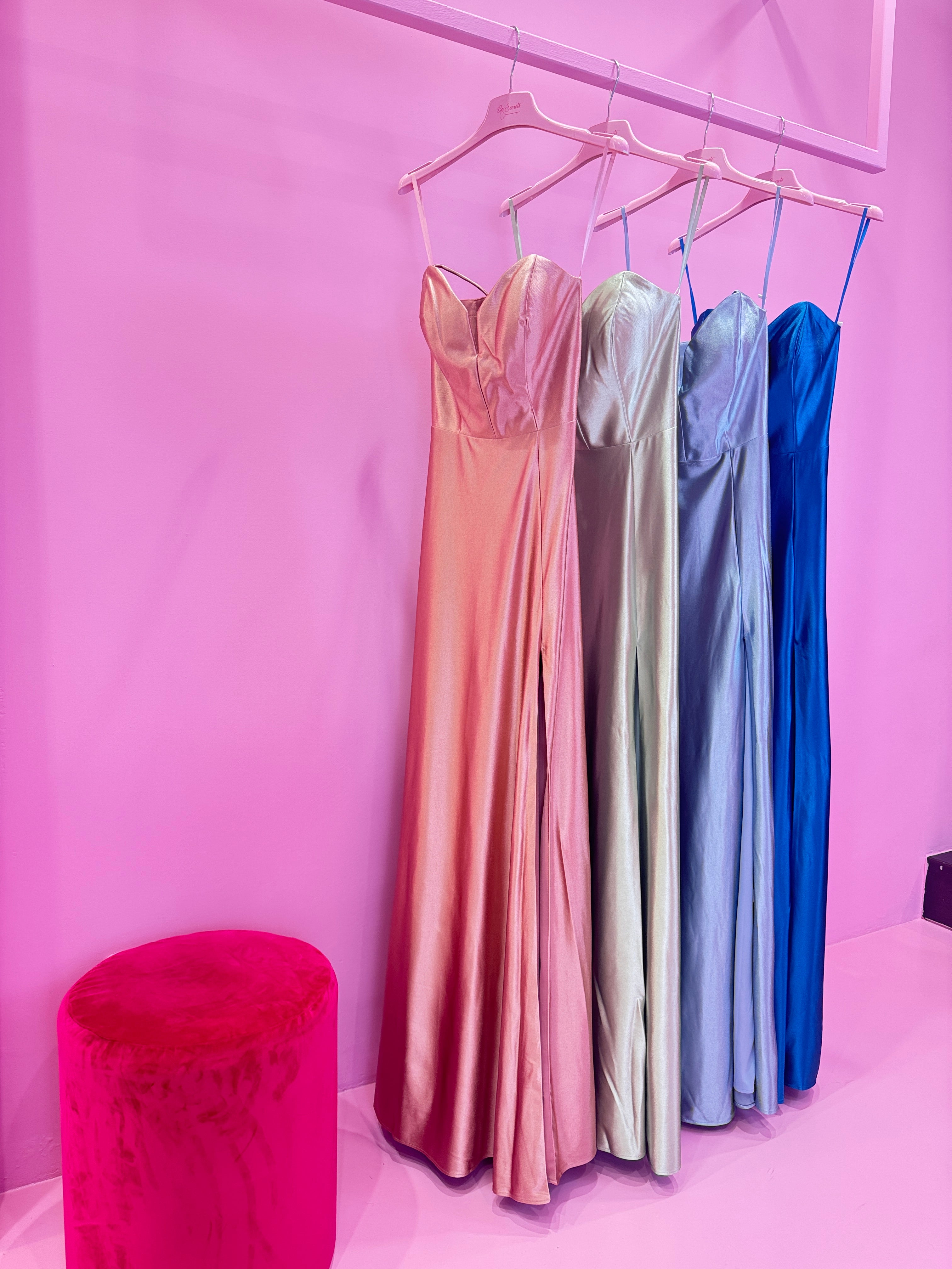 Abiti lunghi in raso con spalline sottili e corpetto a forma di cuore, caratterizzati da una linea fluida ed elegante. Disponibili in diverse tonalità