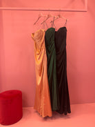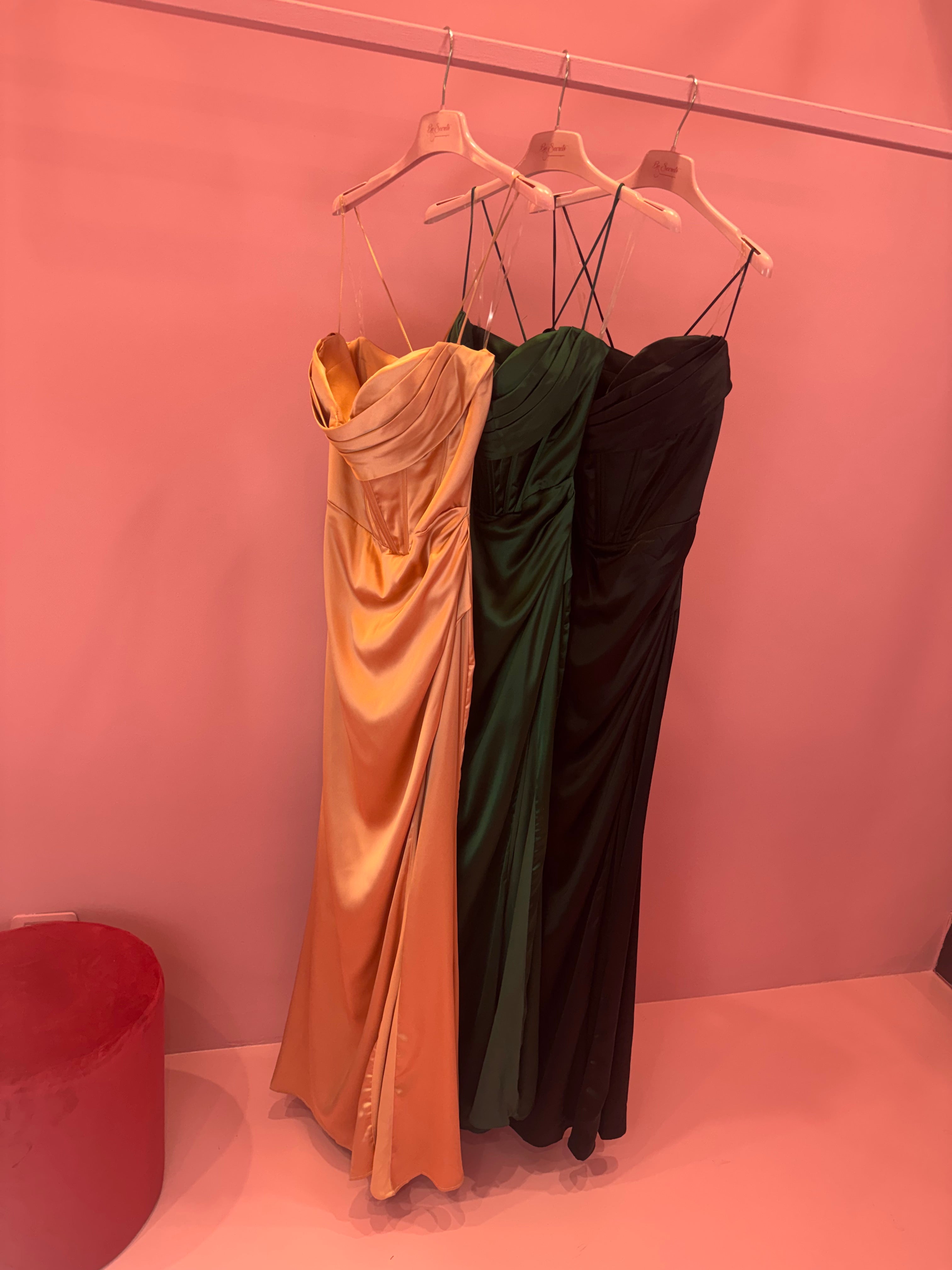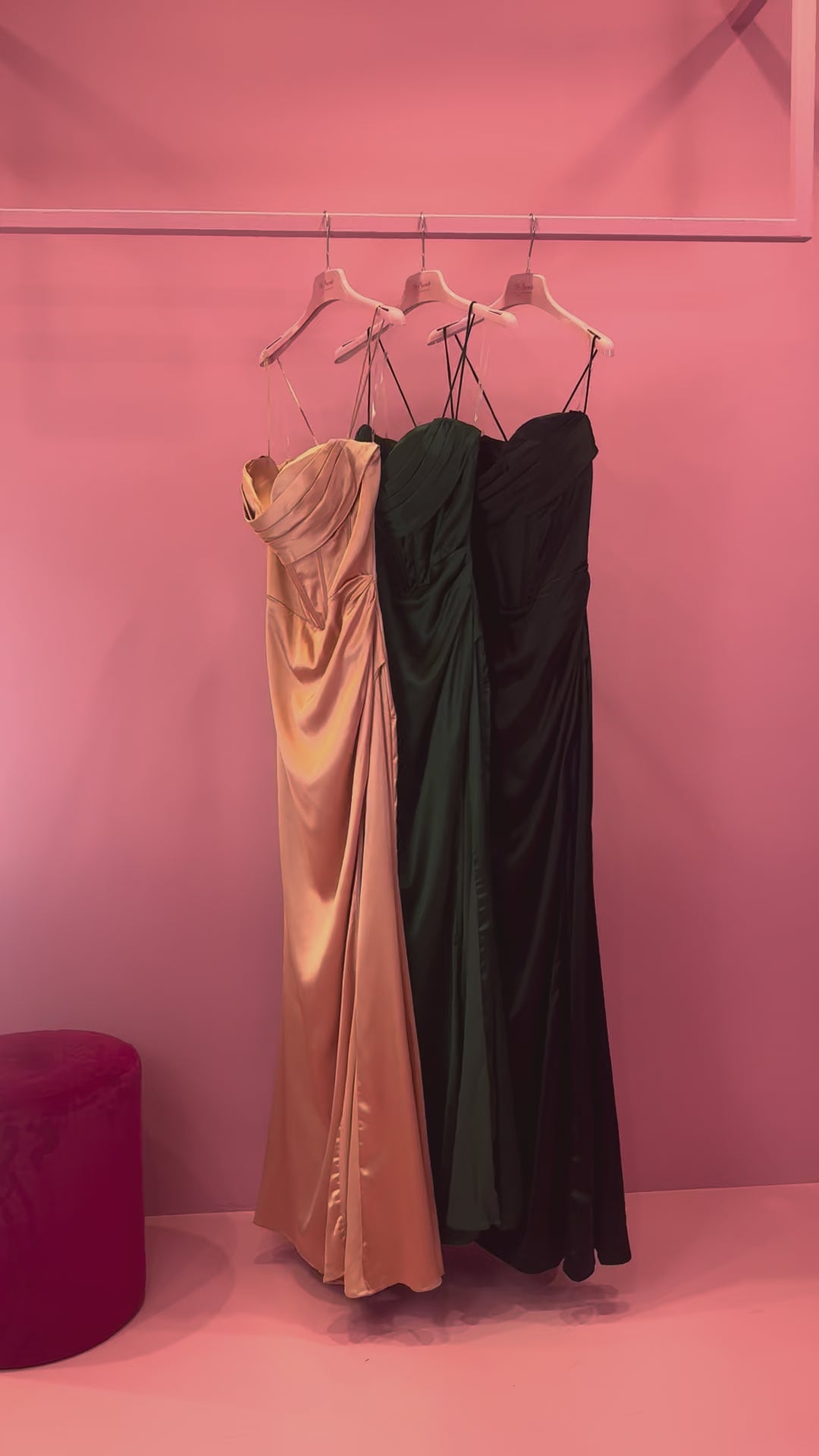 Vestito lungo effetto raso con spalline sottili, dal taglio fluido e femminile. Il drappeggio sul corpetto e sulla gonna valorizza la silhouette, mentre le tonalità eleganti li rendono perfetti per cerimonie.