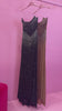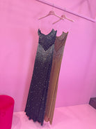 Vestito lungo ed elegante con spalline sottili, realizzato in tessuto fluido e leggero. La superficie è impreziosita da una cascata di strass luminosi che crea un raffinato effetto scintillante.