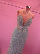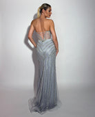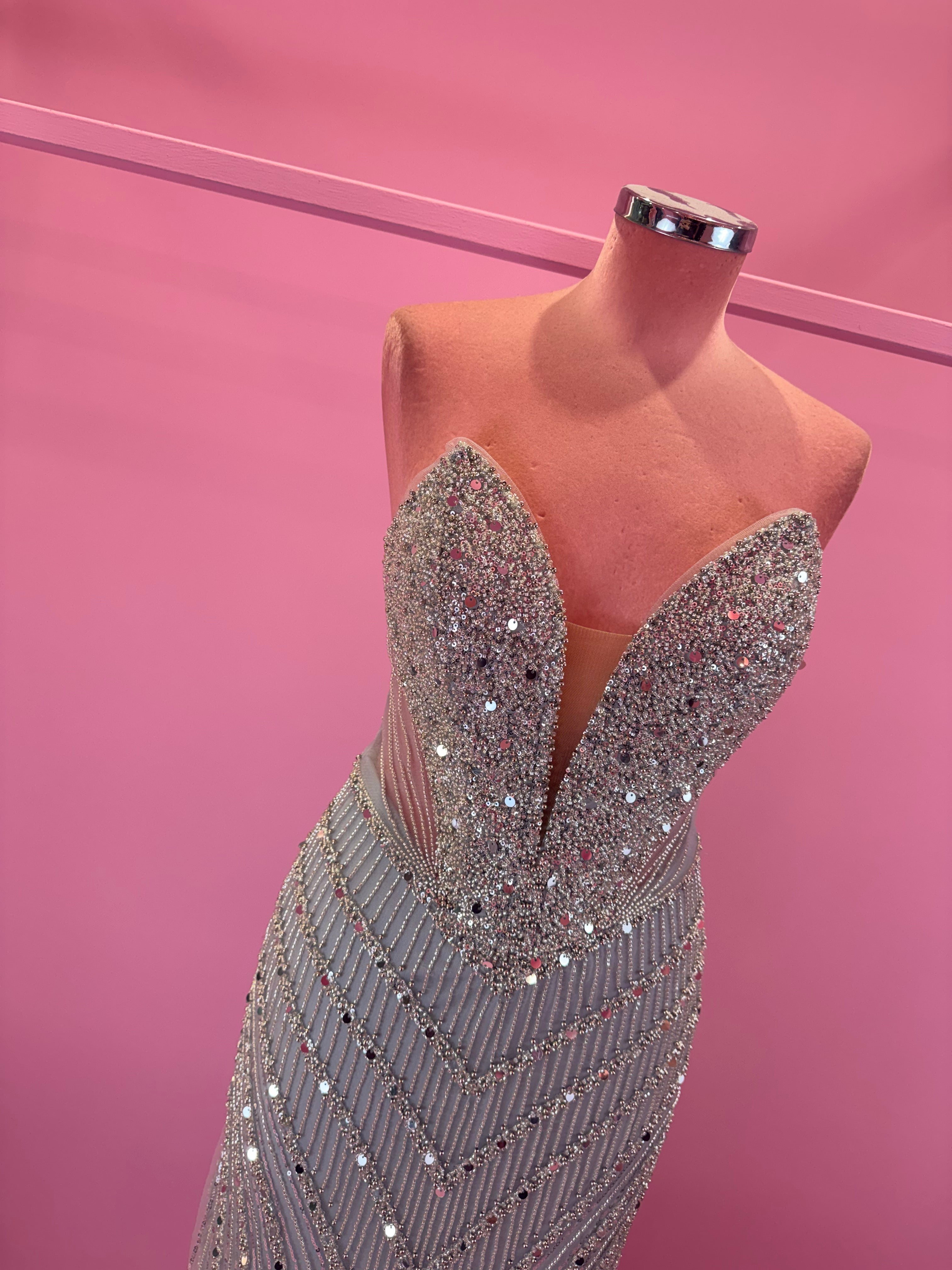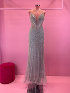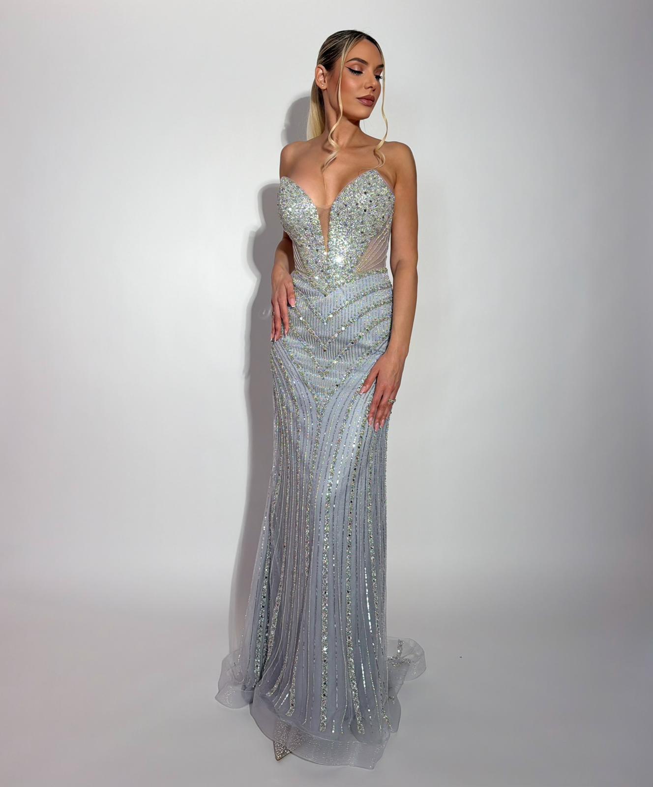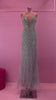 Vestito lungo color argento, molto elegante e scintillante, con profondo scollo a V e corpetto strutturato che valorizza il punto vita. I ricami luminosi seguono linee verticali e geometriche, slanciando la figura e creando un raffinato effetto scenografico.