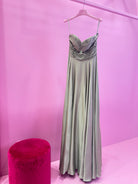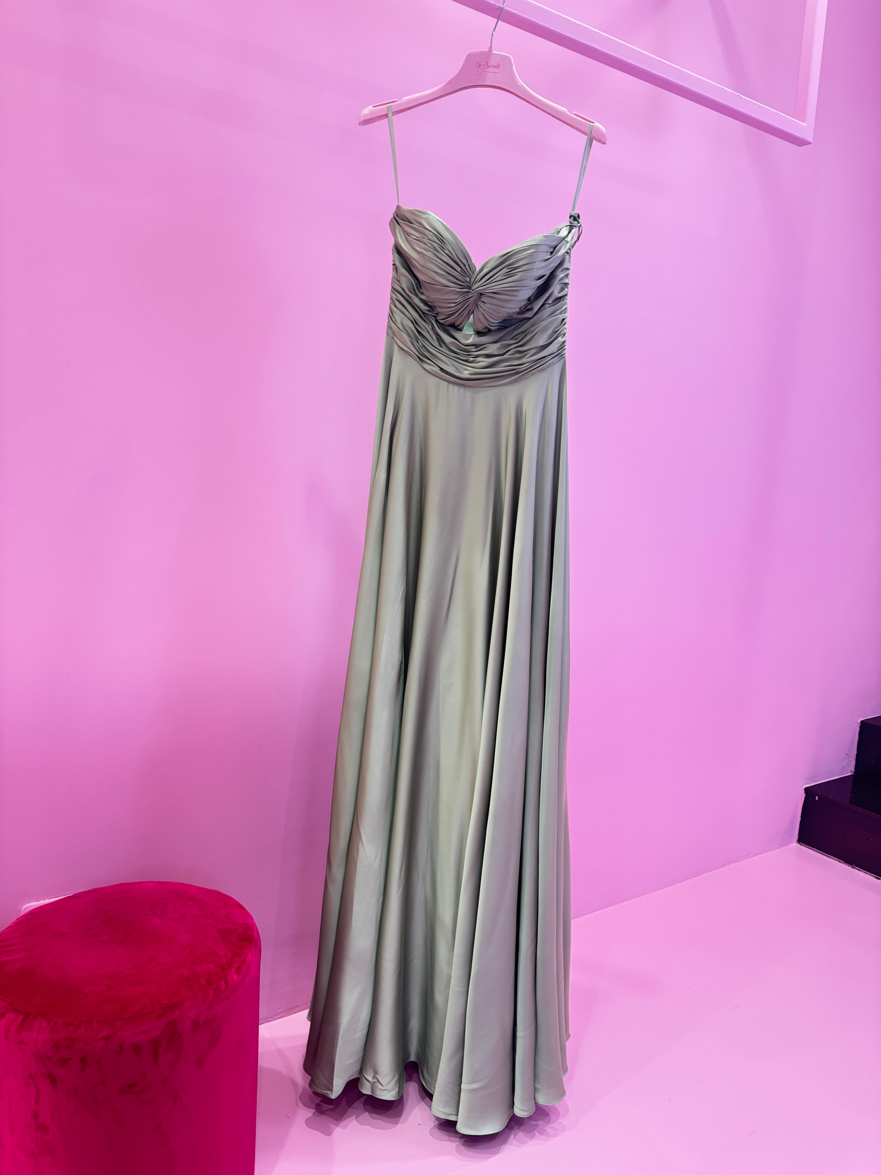 Abito lungo color verde salvia dal design delicato ed elegante. Il corpetto drappeggiato con scollo a cuore e spalline sottili valorizza il décolleté, mentre la gonna ampia e fluida scende morbida creando movimento.