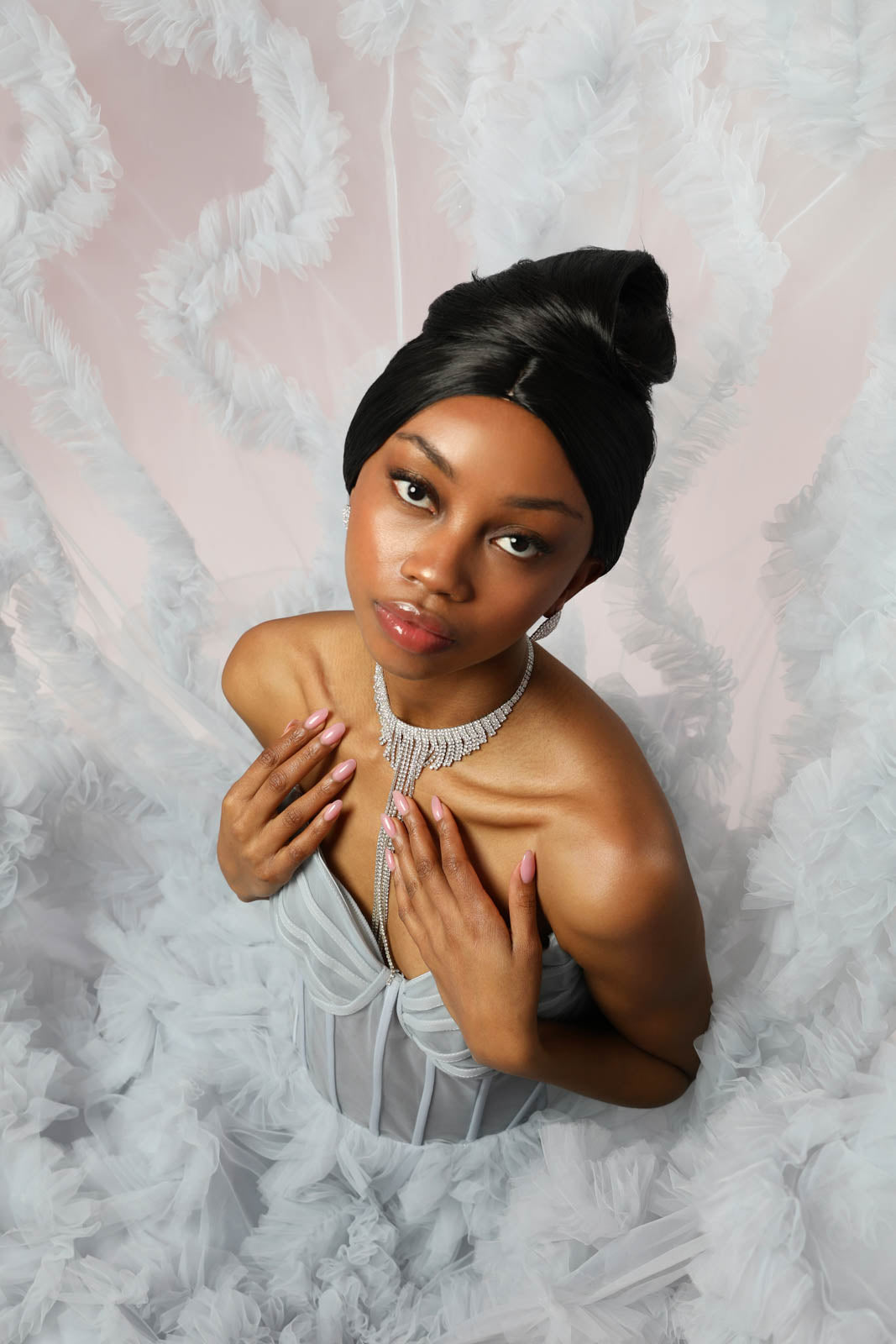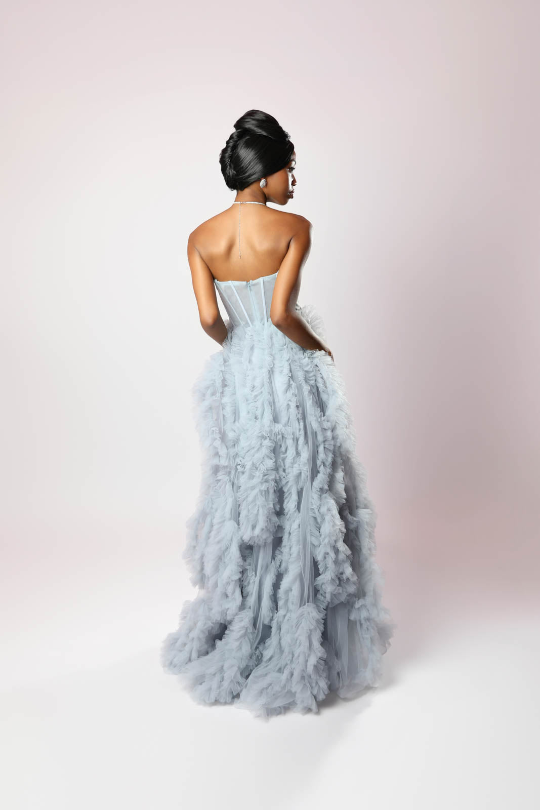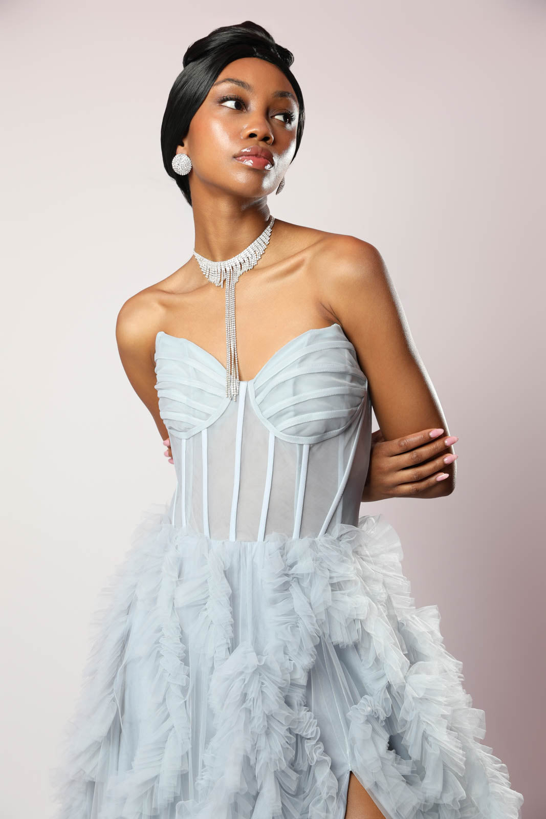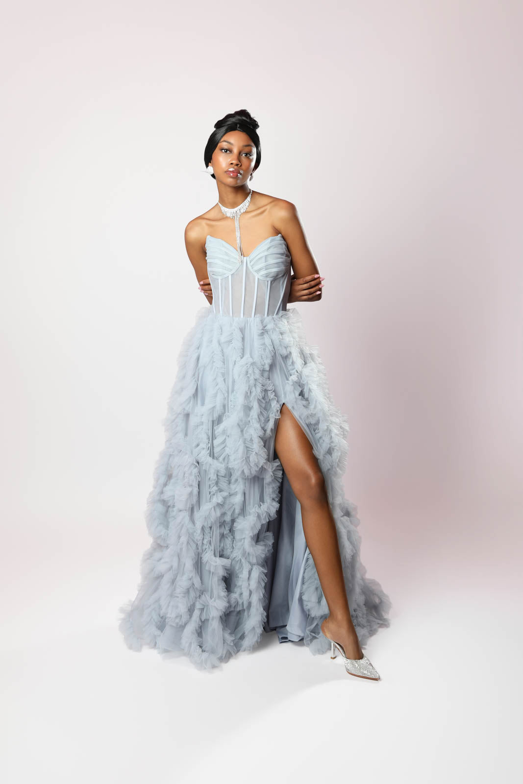 Brilla con eleganza assoluta in questo abito da sogno, perfetto per chi ama il lusso e la raffinatezza. Il scollo a V esalta il décolleté con sensualità, mentre il corsetto strutturato scolpisce la silhouette, offrendo una vestibilità impeccabile.
