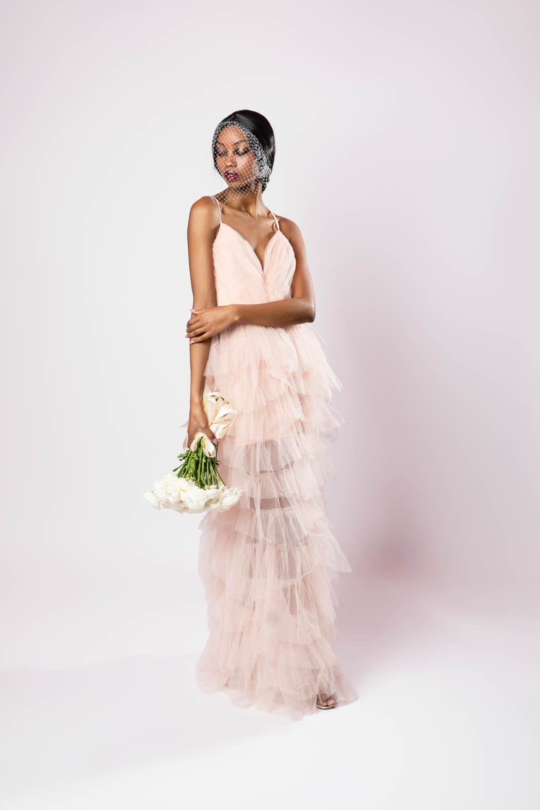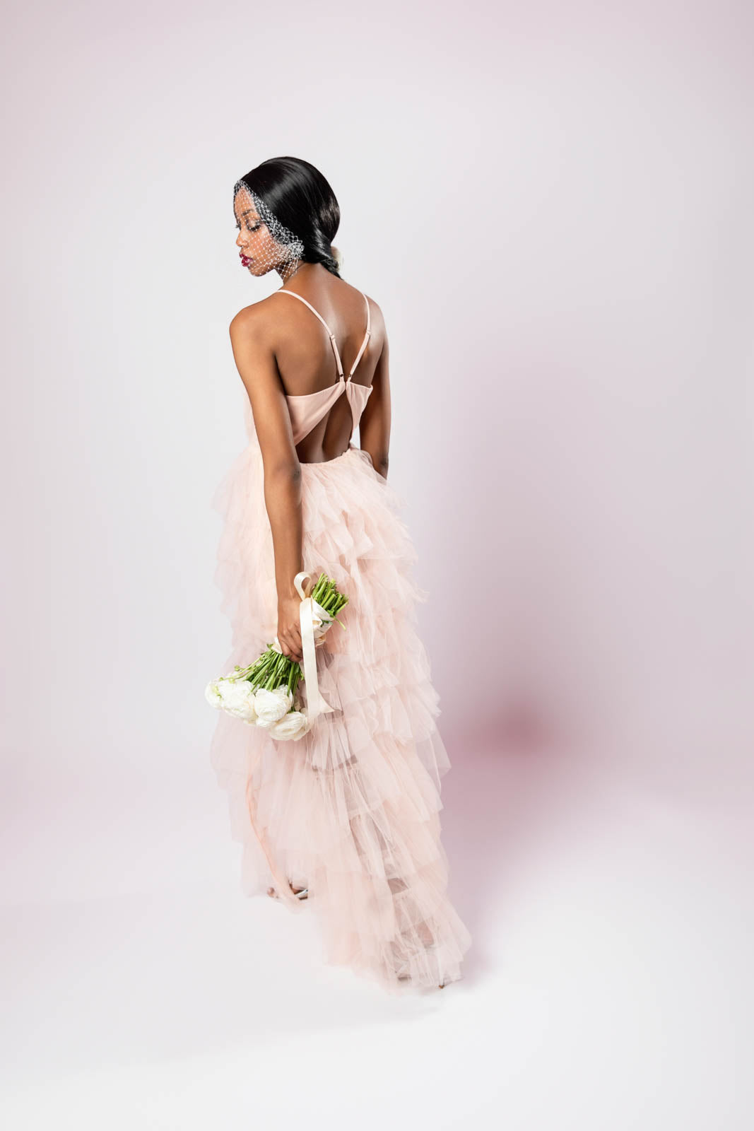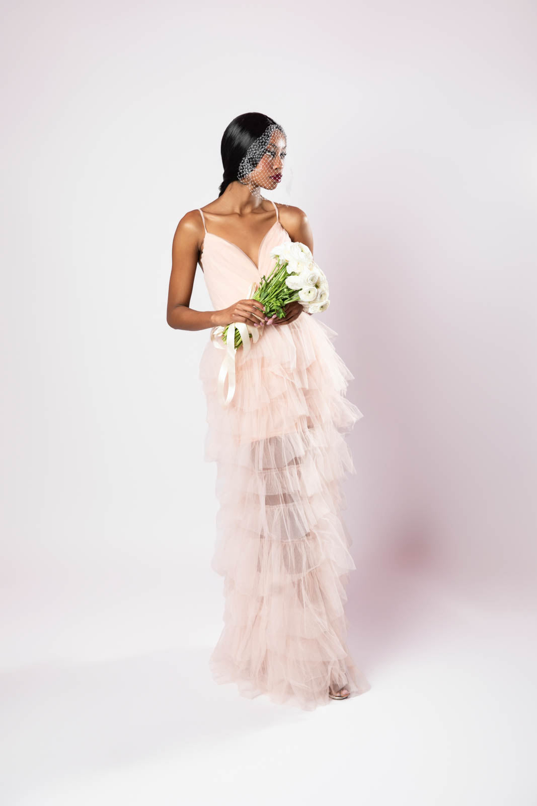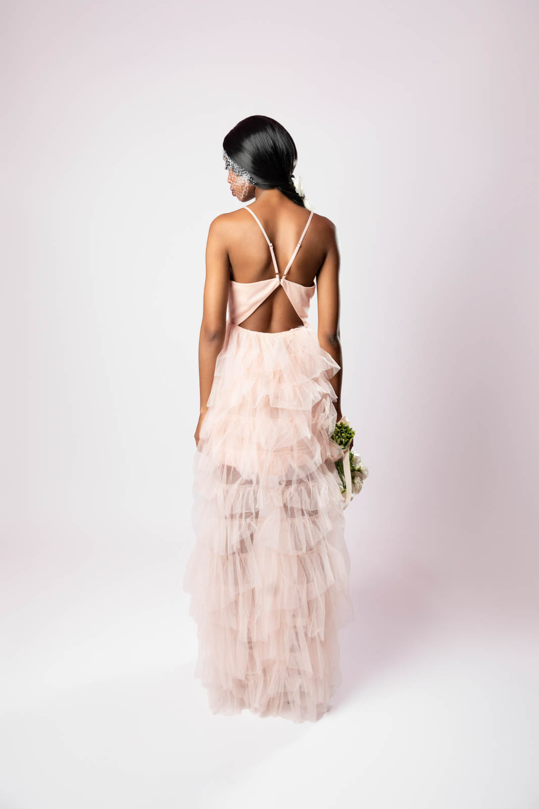 La vera protagonista è la gonna in tulle a balze, che crea volume e movimento ad ogni passo, per un effetto etereo e fiabesco. Perfetto per cerimonie, eventi di gala e occasioni speciali, è l’abito ideale per chi ama distinguersi con grazia e leggerezza.