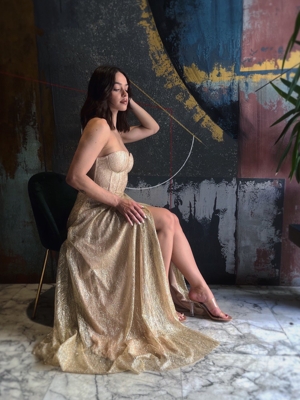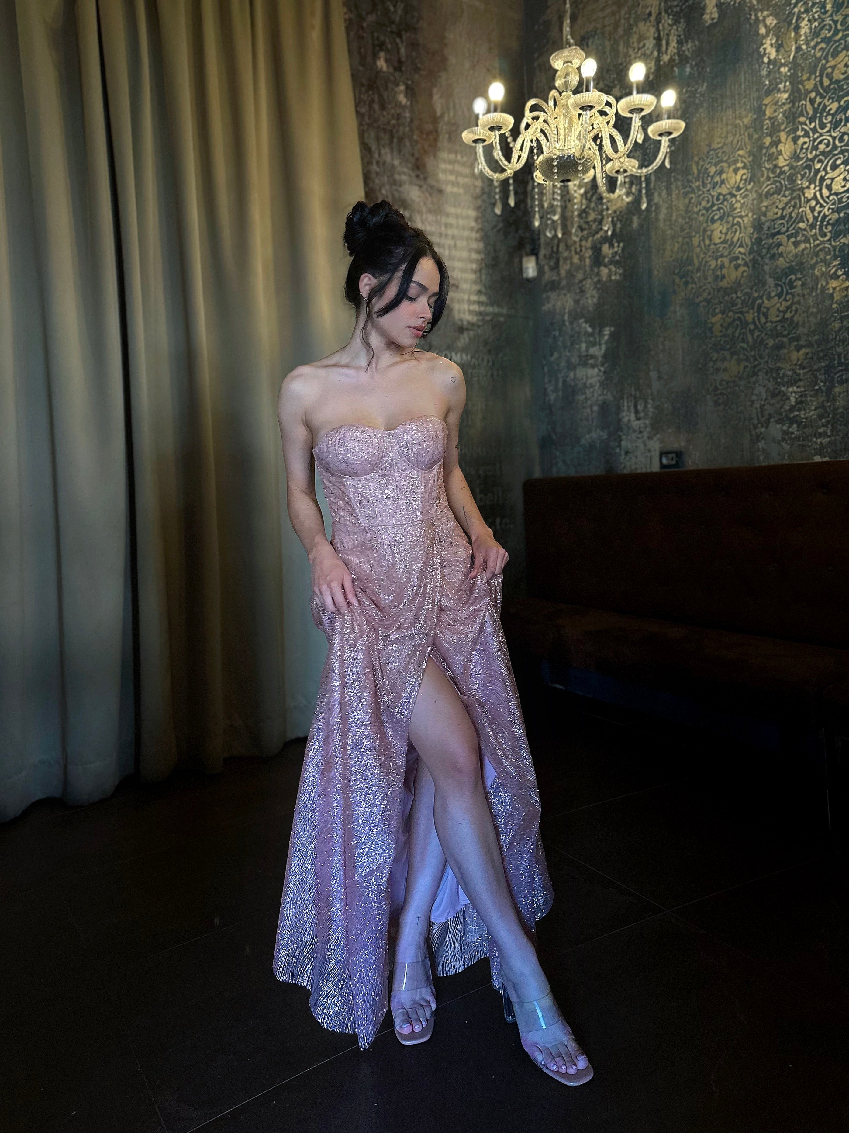 Scopri il nostro Vestito a corsetto con scollatura a cuore, realizzato con glitter.