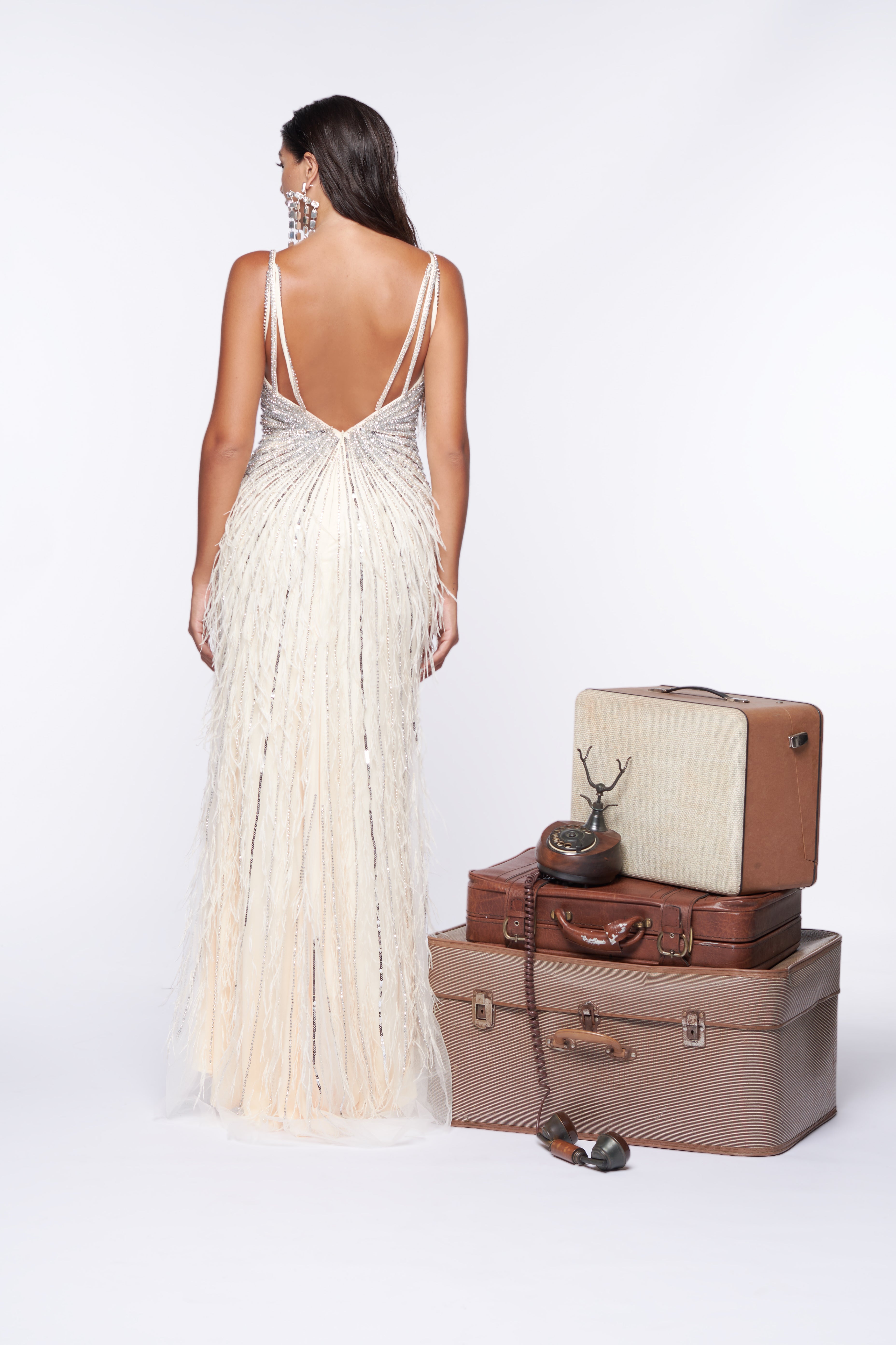 -Vestito luxury in tessuto 50% seta con piume e brillantini applicati a mano dalla nostre sarte