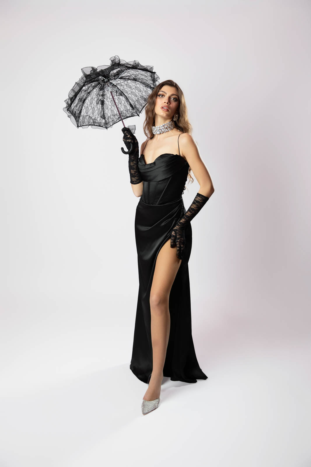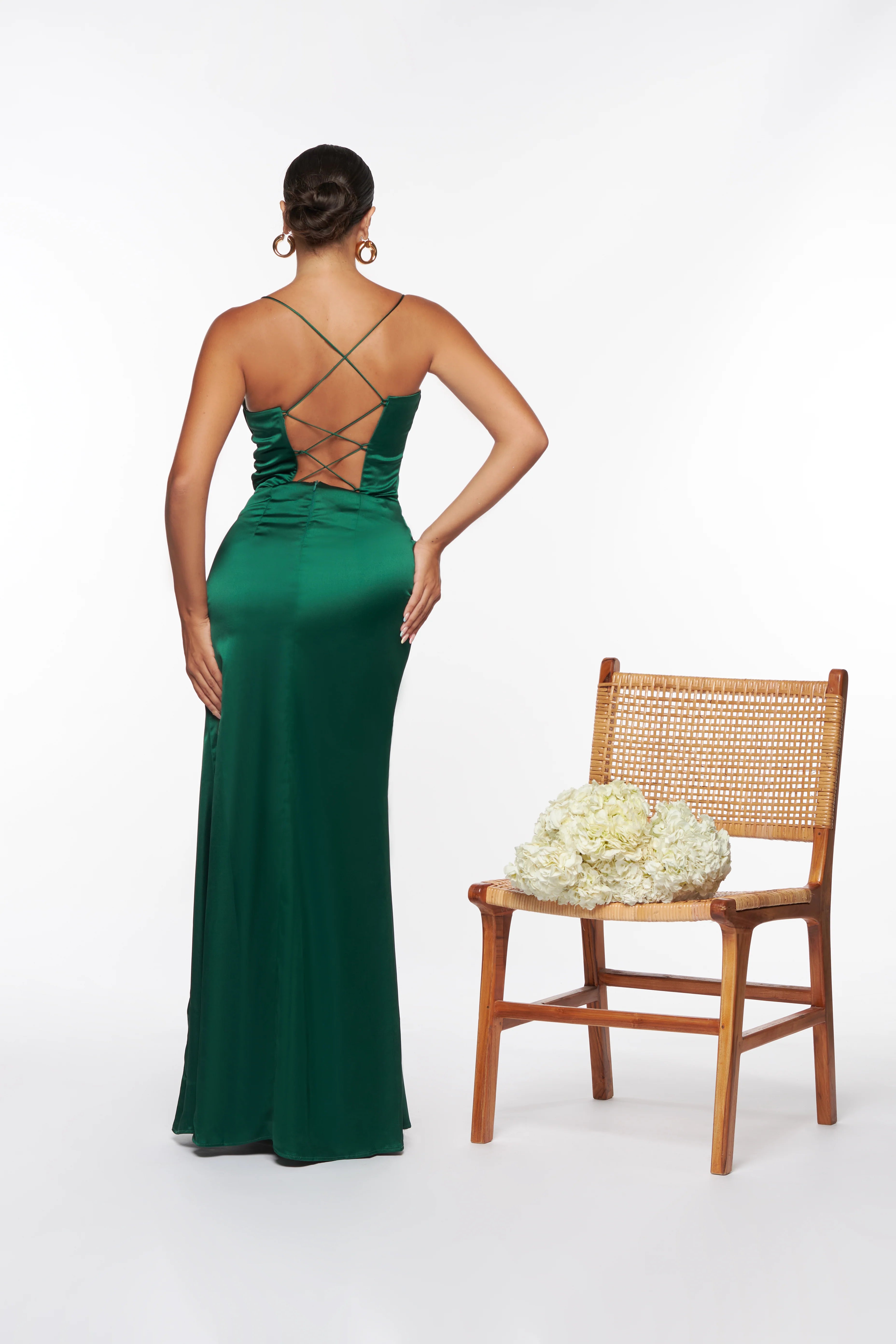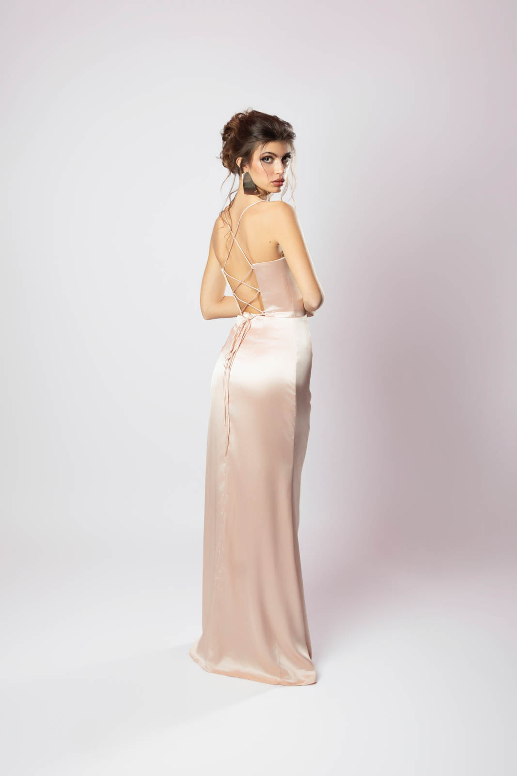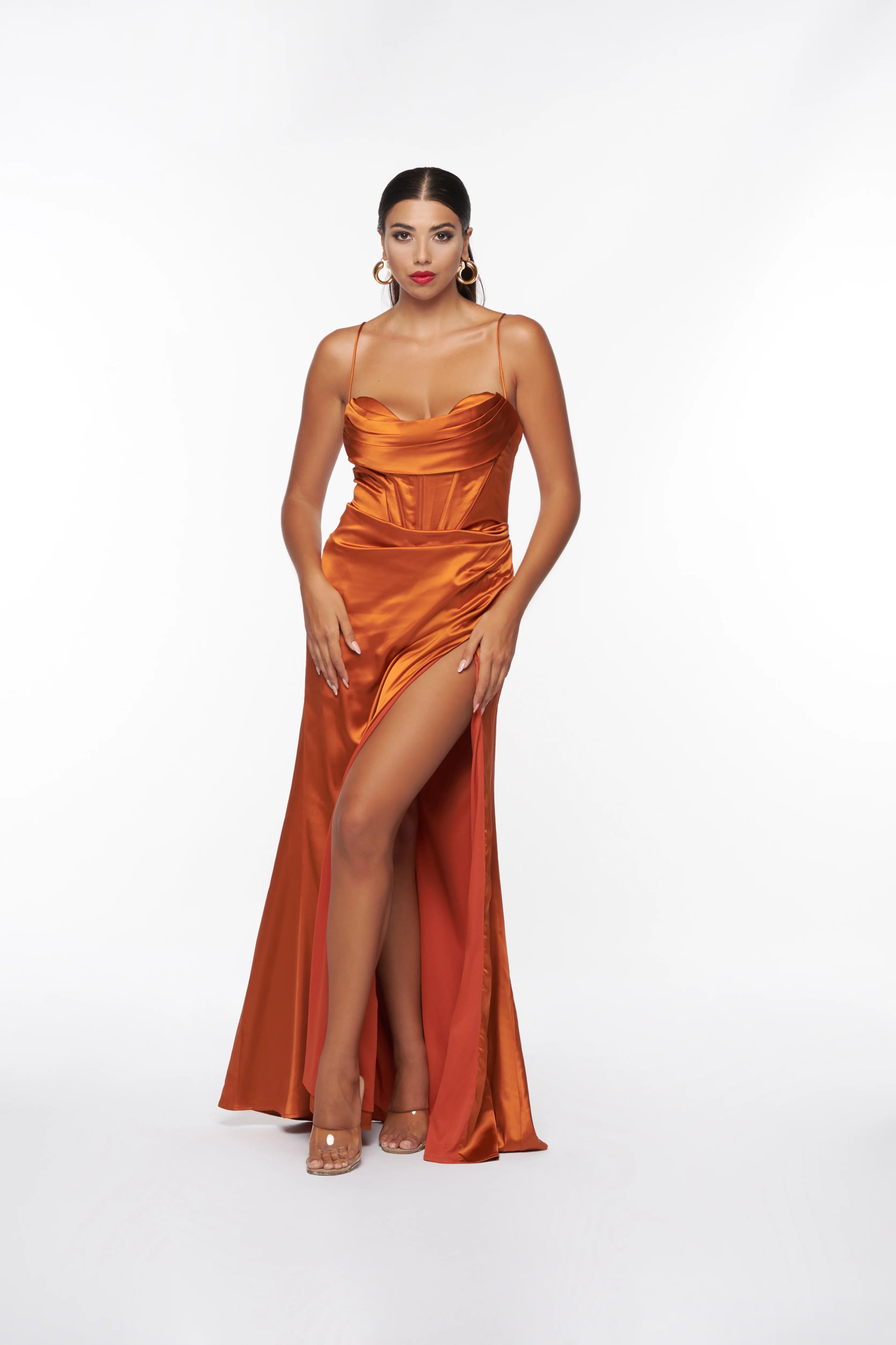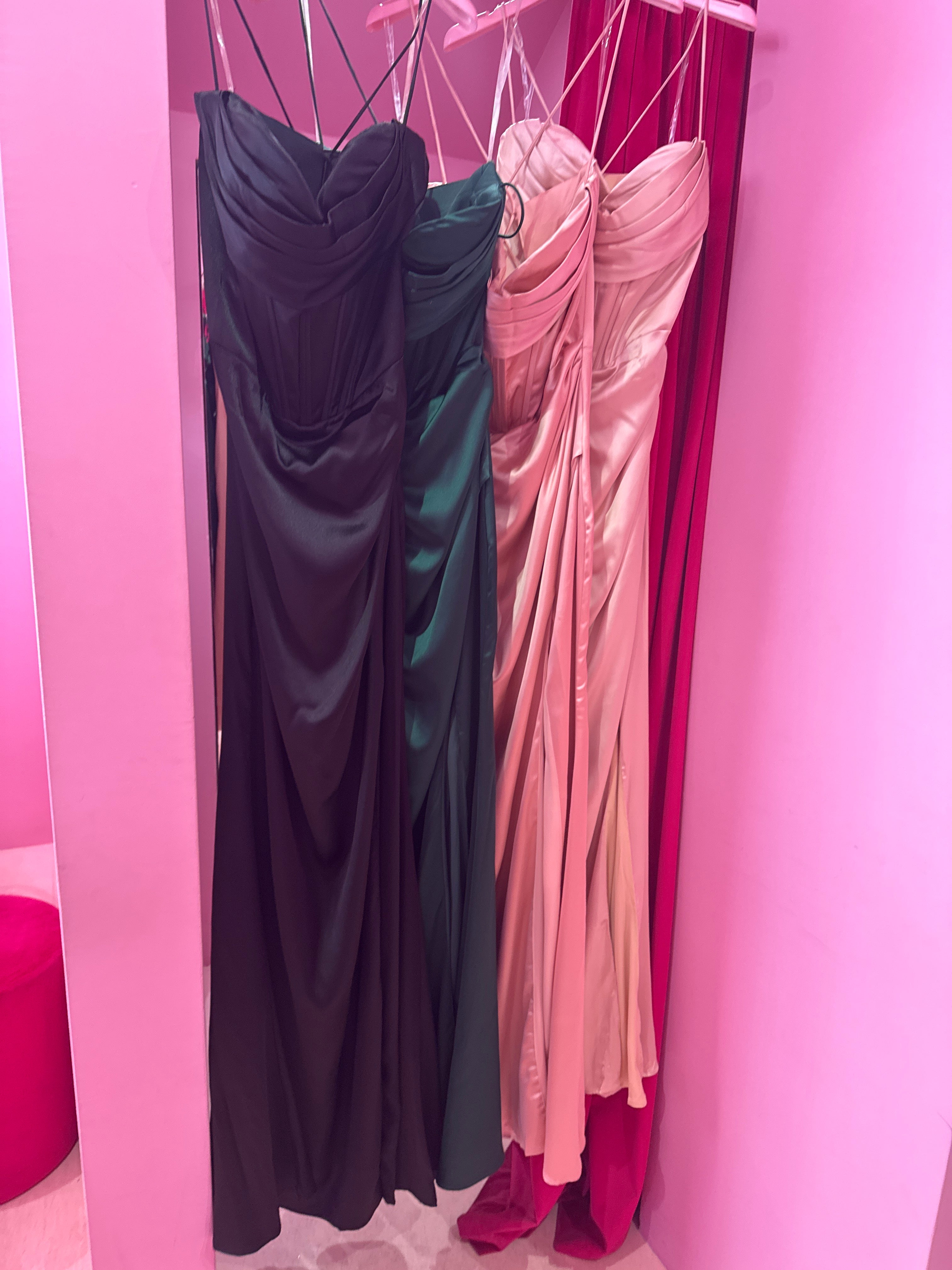 Elegante e raffinato questo abito in effetto seta avvolge la silhouette con la sua texture luminosa e fluida la scollatura a V esalta il décolleté con sensualità mentre il corsetto strutturato definisce il punto vita creando una linea sinuosa lo spacco sulla gamba aggiunge un tocco audace e sofisticato perfetto per occasioni speciali e serate eleganti un capo che unisce classe e raffinatezza in un design senza tempo.