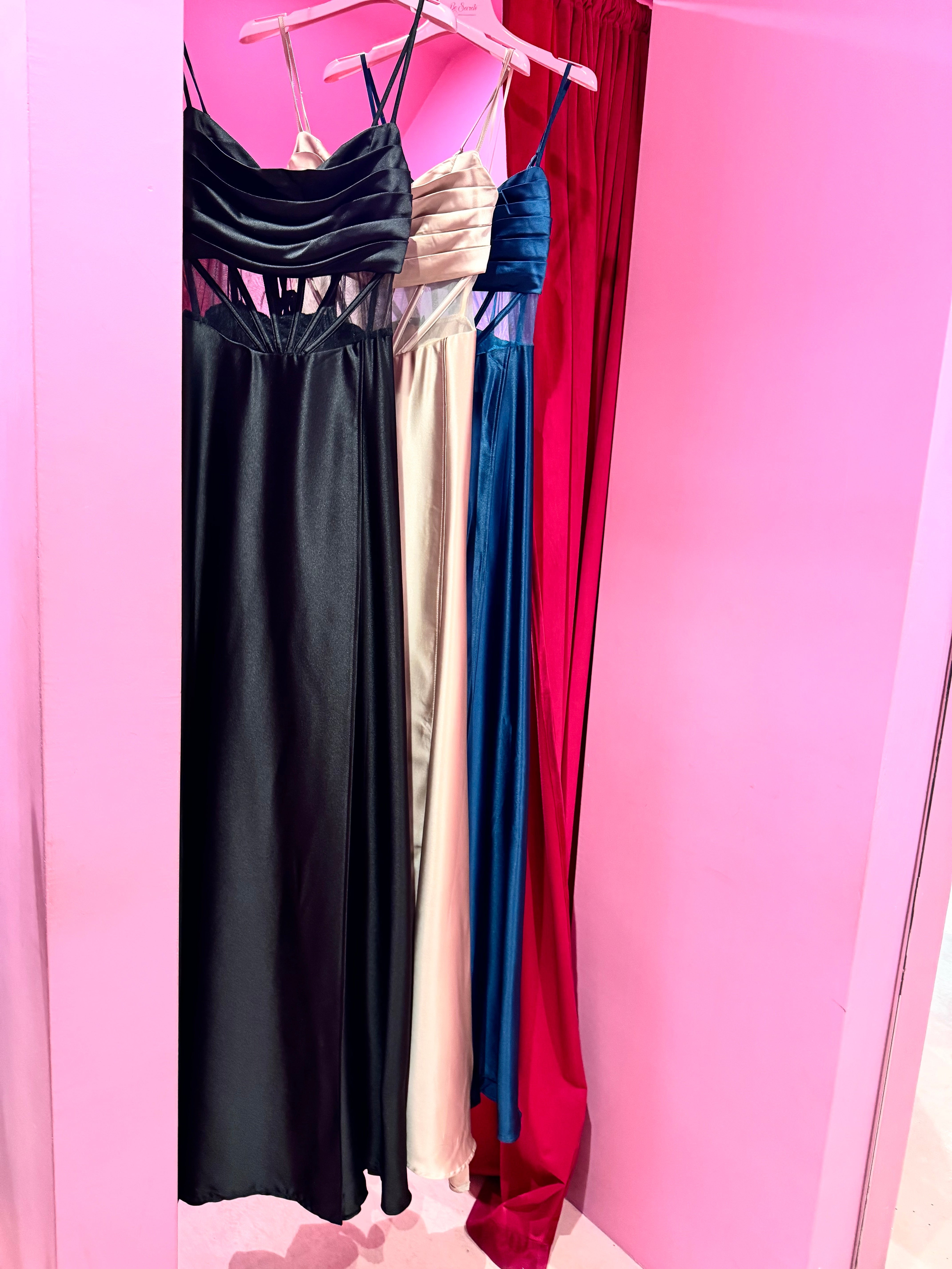 Elegante e raffinato, questo abito in effetto seta avvolge la silhouette con la sua texture fluida e luminosa. Il corsetto strutturato, impreziosito da un delicato plissé, esalta il punto vita donando femminilità e armonia alla figura. Disponibile nelle tonalità nero, oro e blu, questo modello è perfetto per occasioni speciali e serate eleganti, un capo senza tempo che unisce classe e sofisticatezza.