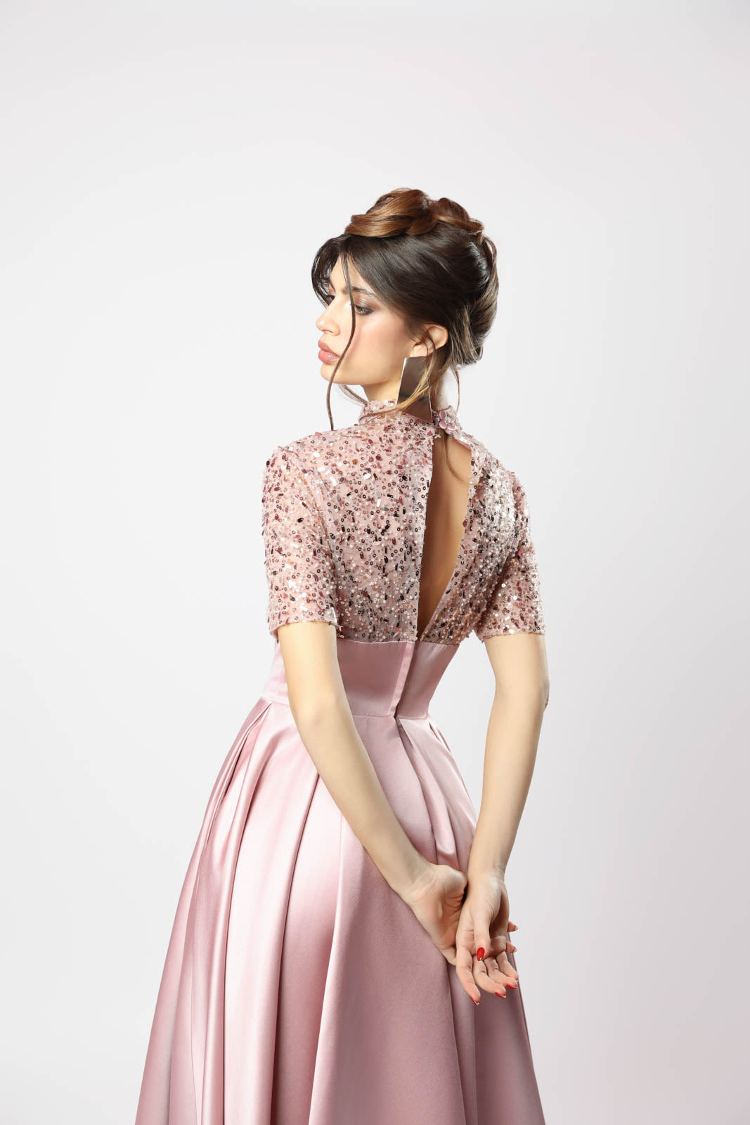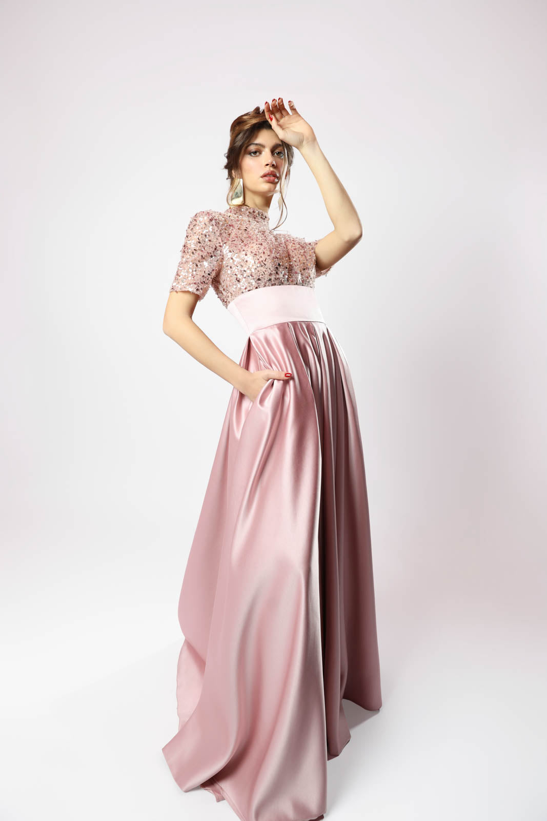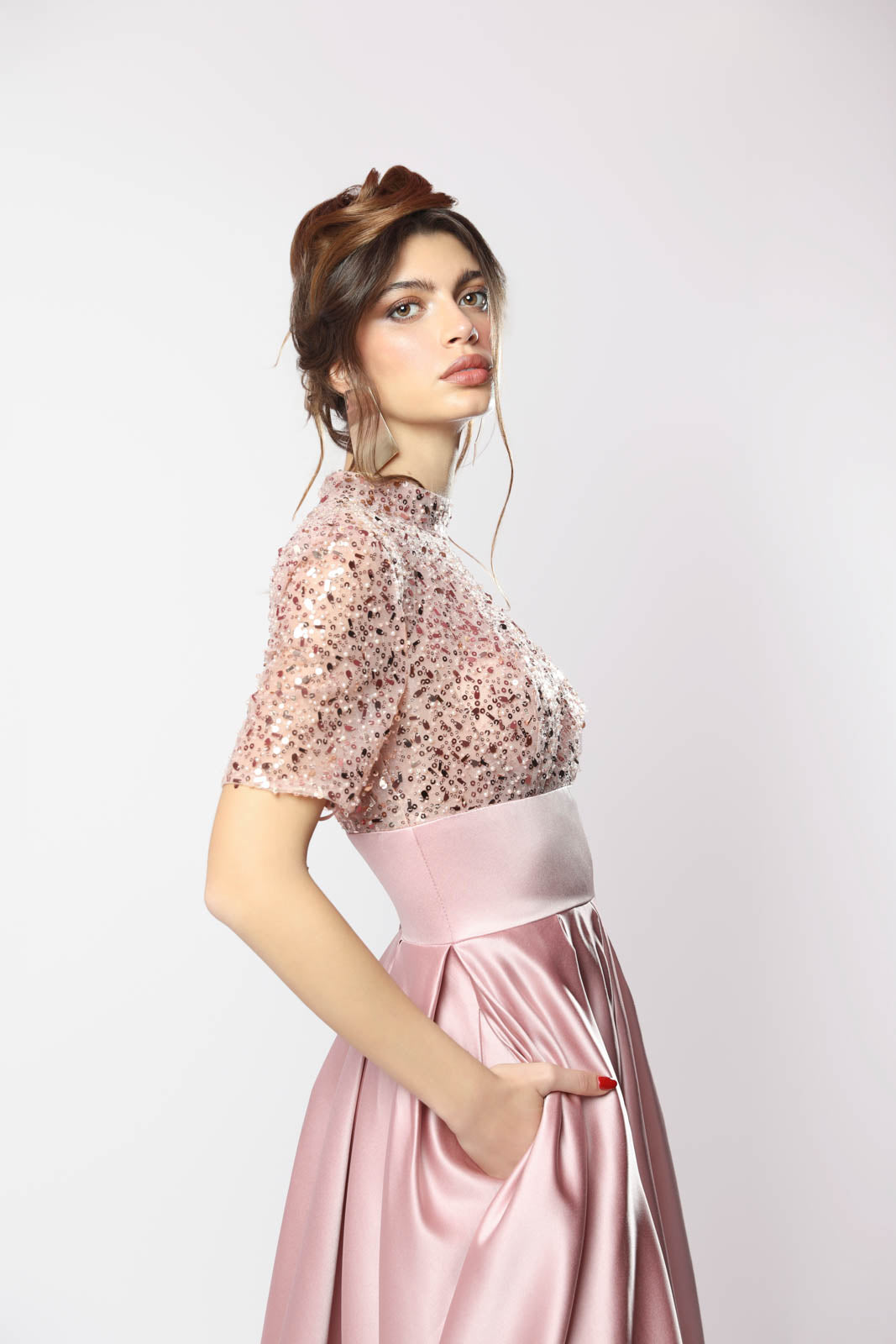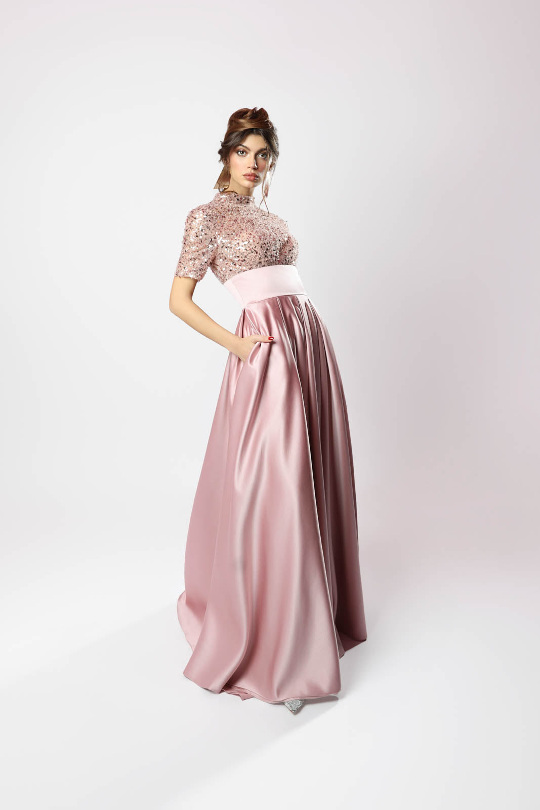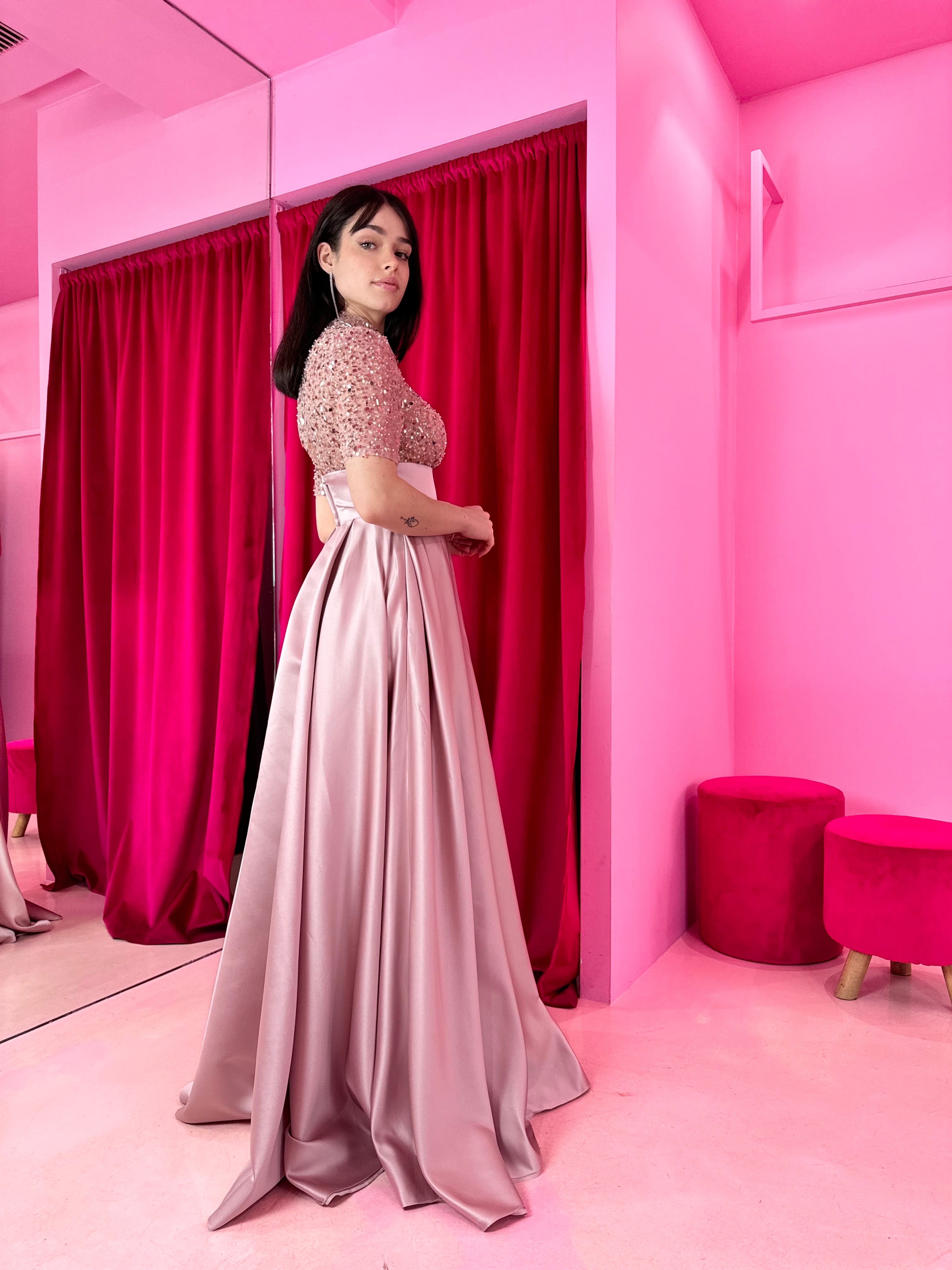 Un abito lungo rosa con uno spacco laterale, realizzato in un tessuto fluido che segue armoniosamente la silhouette. Il busto è interamente ricoperto di paillettes, creando un effetto luminoso e raffinato. Un cinturino in vita definisce la figura, aggiungendo un dettaglio elegante. Il design combina sensualità e sofisticatezza, rendendolo adatto a eventi formali e occasioni speciali.
