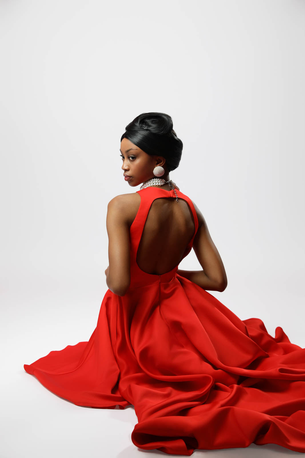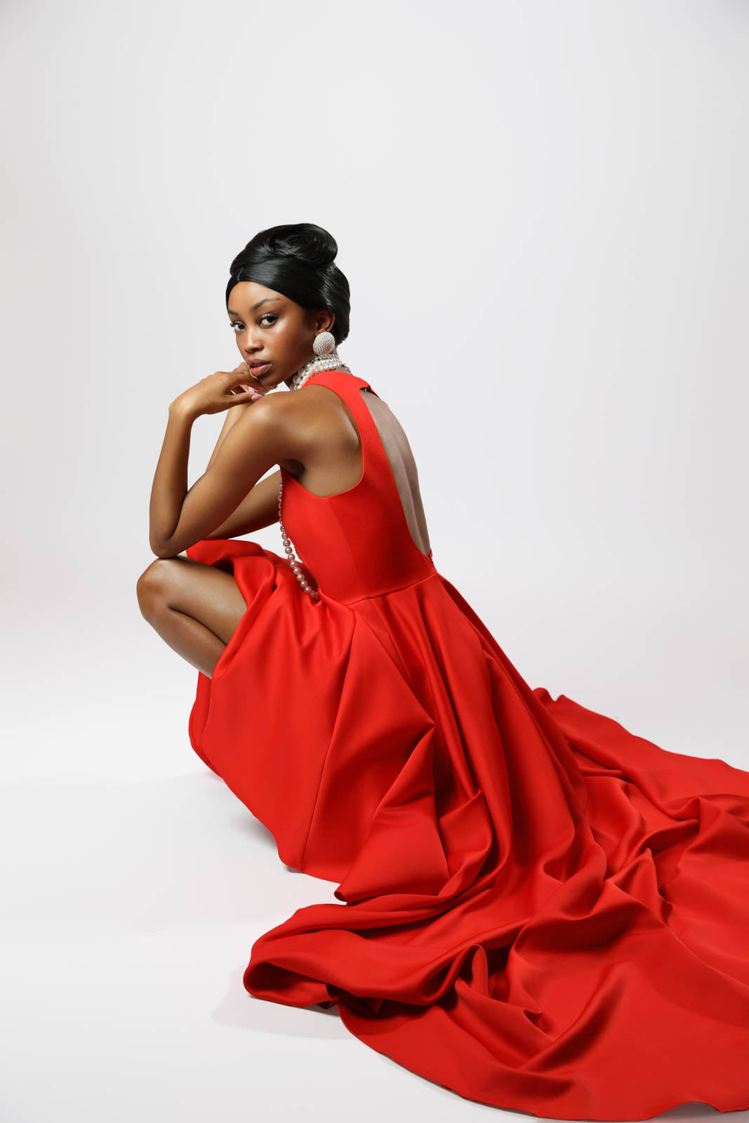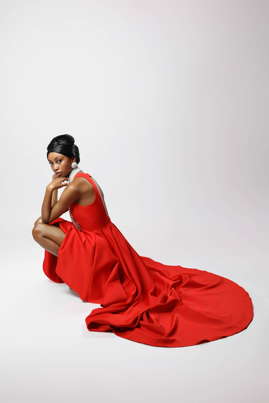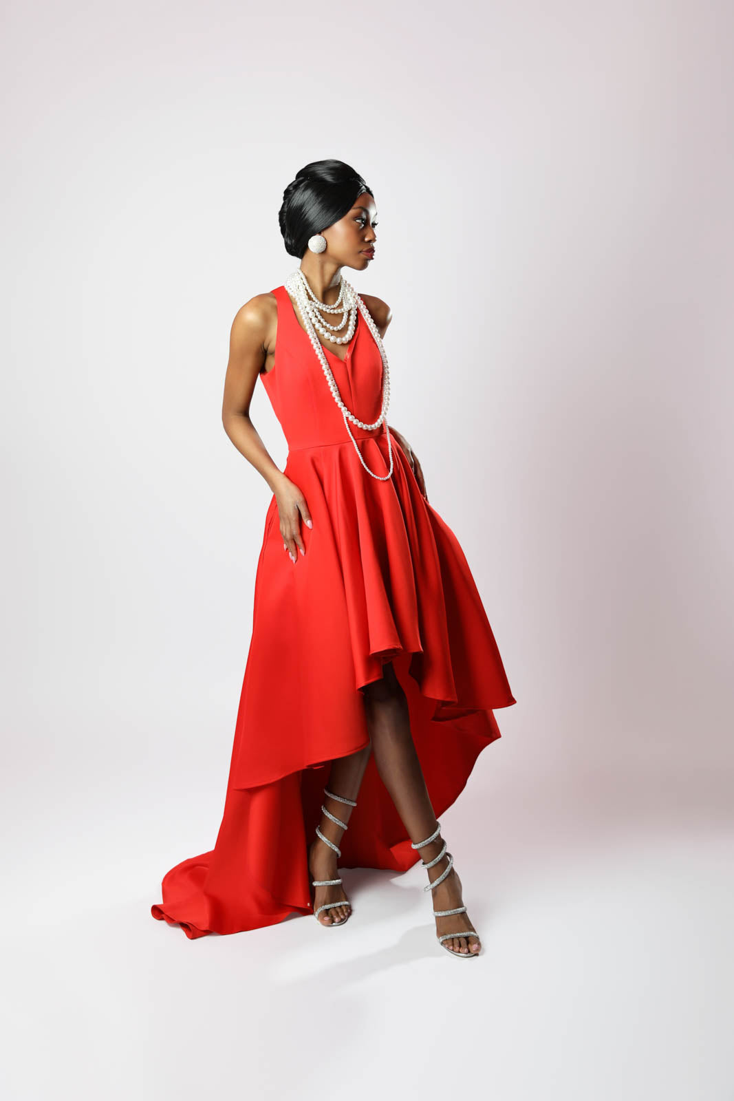 Vestito con scollatura a cuore con bottoni sul retro, schiena scoperta con chiusura con zip. Il fondo del abito è asimmetrico, più lungo sul retro più corto sul davanti