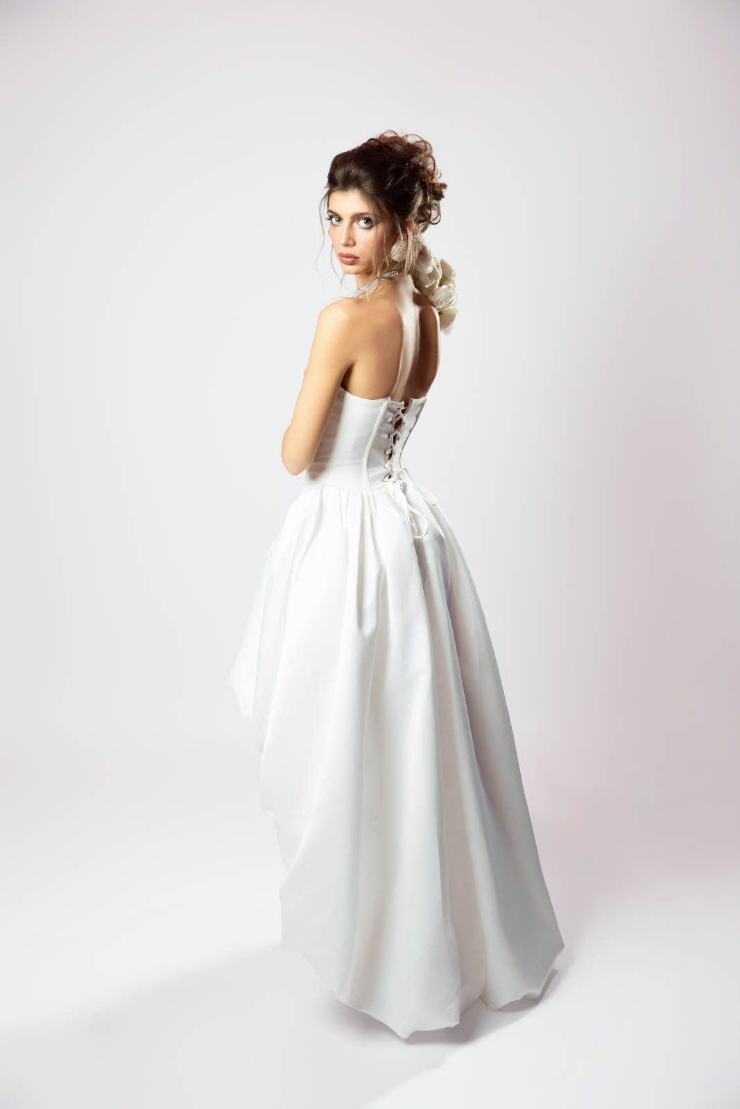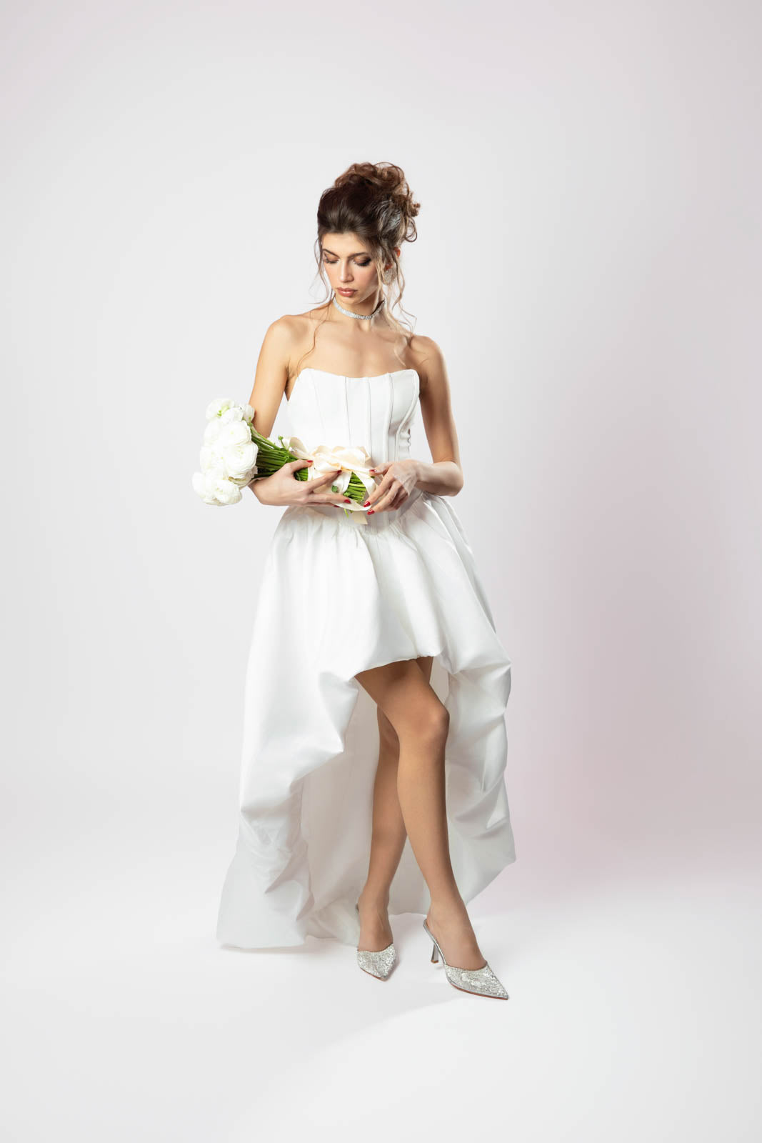 La vera protagonista è la gonna a palloncino asimmetrica, che crea volume e movimento con un effetto scenografico. Il design asimmetrico aggiunge un tocco moderno e dinamico, perfetto per distinguersi con classe in ogni occasione speciale.