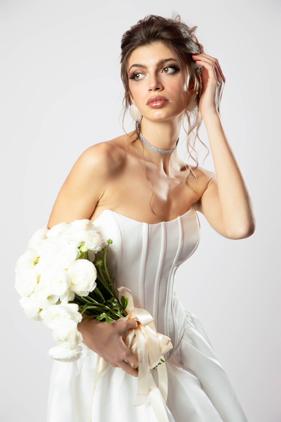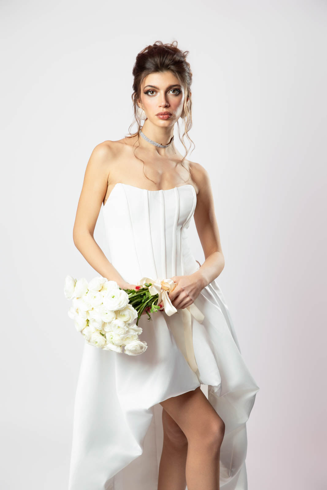 Esalta la tua femminilità con questo abito unico e sofisticato, perfetto per chi ama un look elegante e originale. Il corpetto strutturato con scollatura a cuore valorizza il décolleté con grazia, mentre il corsetto aderente scolpisce la silhouette, offrendo una vestibilità impeccabile.