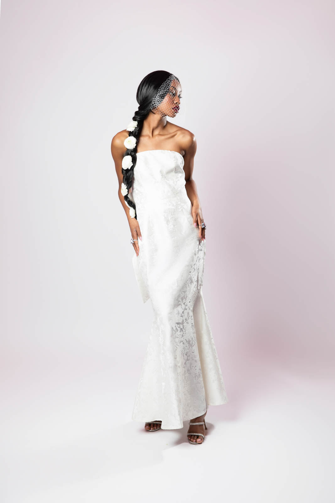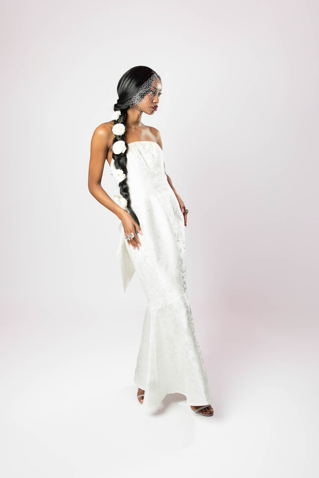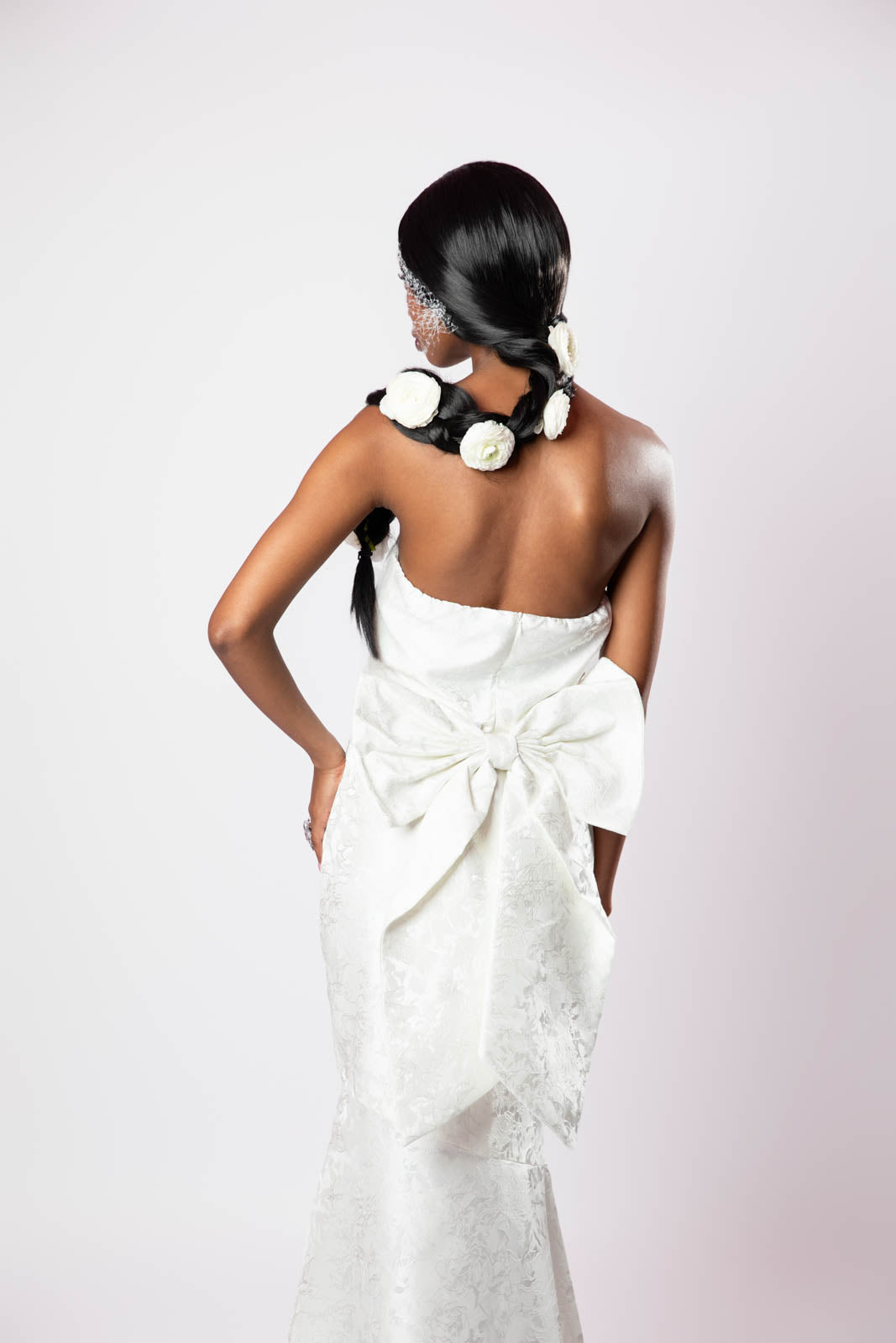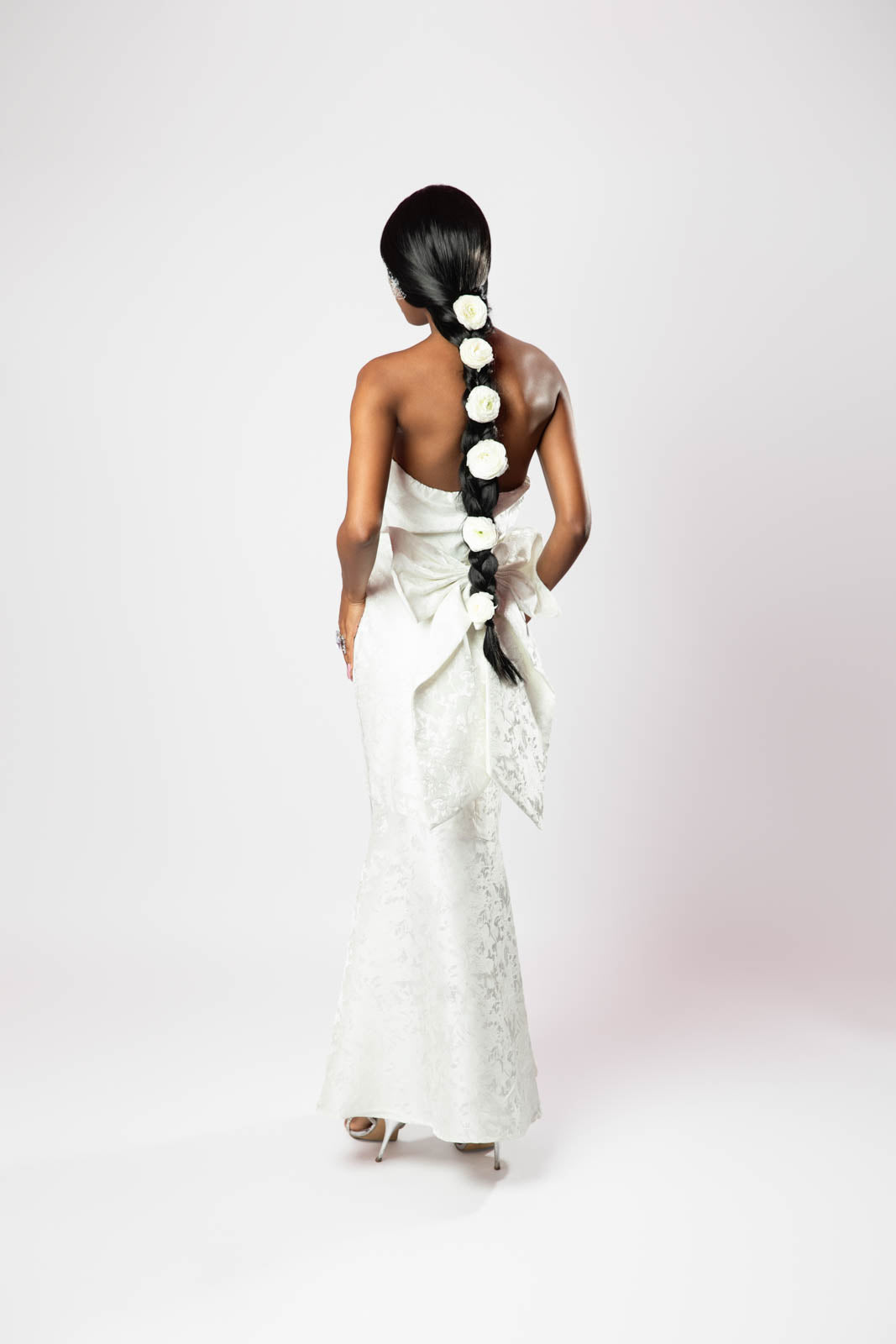 Il dettaglio distintivo è un fiocco sul retro, che aggiunge eleganza e femminilità al design. Perfetto per cerimonie ed eventi speciali, unisce stile e raffinatezza in un abito senza tempo.